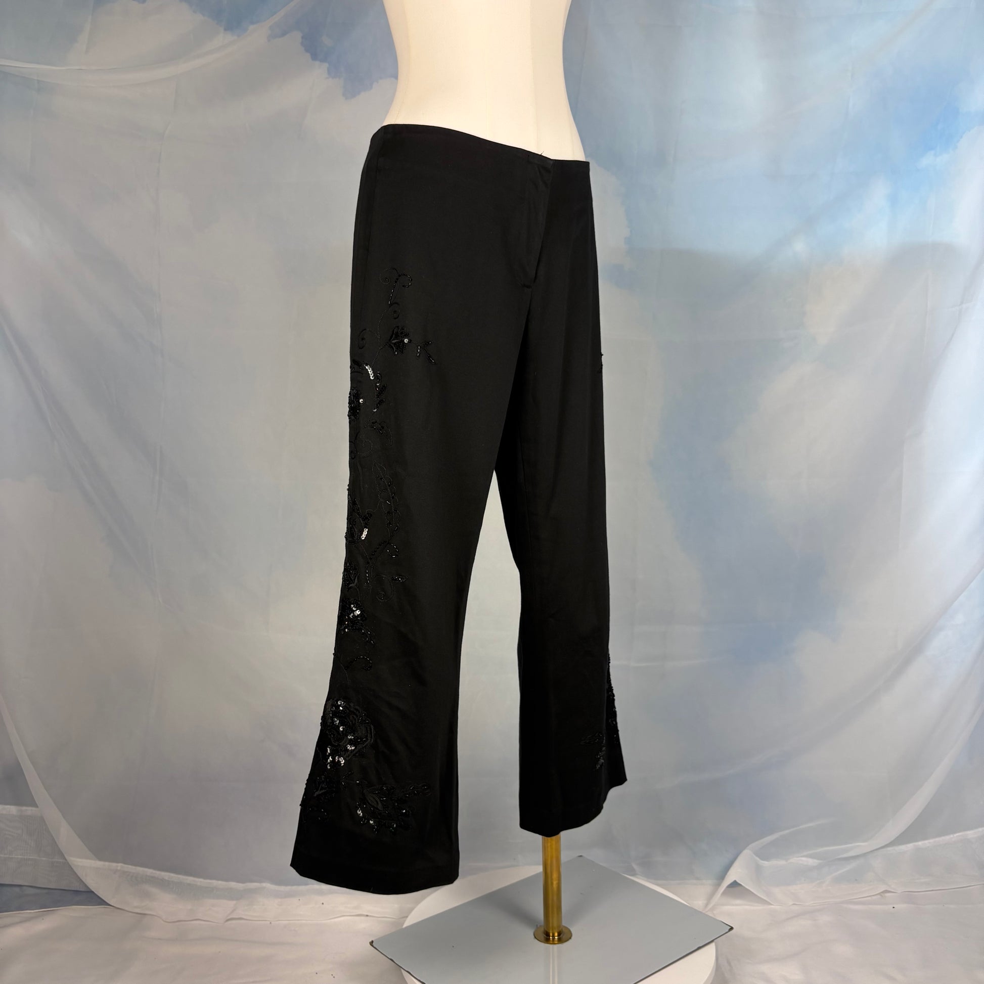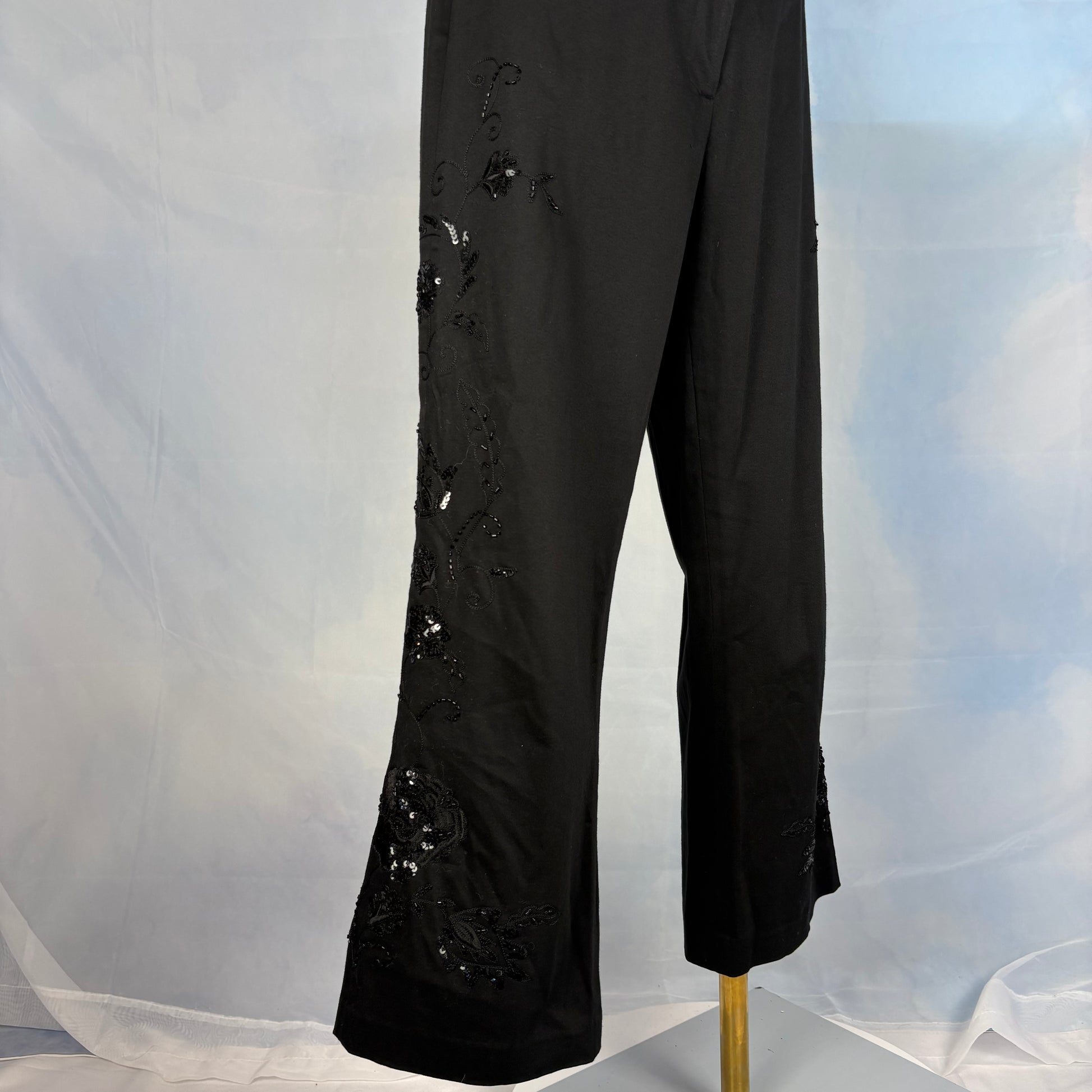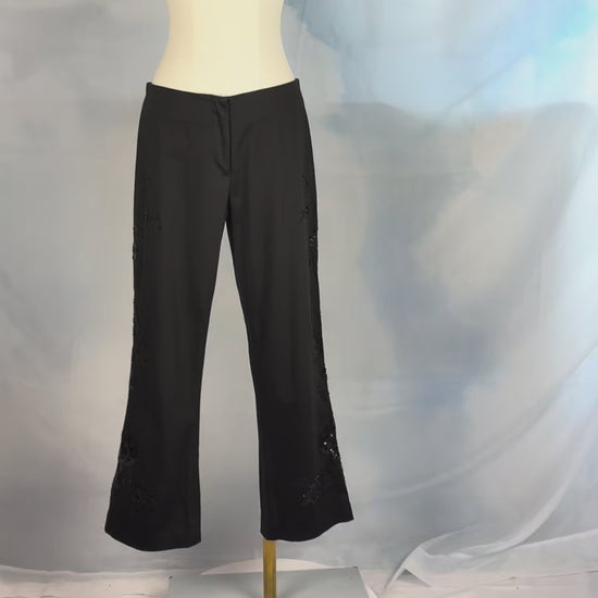 Low-rise black pants featuring floral sequin embroidery along both sides of the legs. Designed with a sleek straight silhouette. Finished with a front zipper closure. *Note: Rise may feel higher or lower depending on your proportions. Please compare measurements in Size Guide to your own.