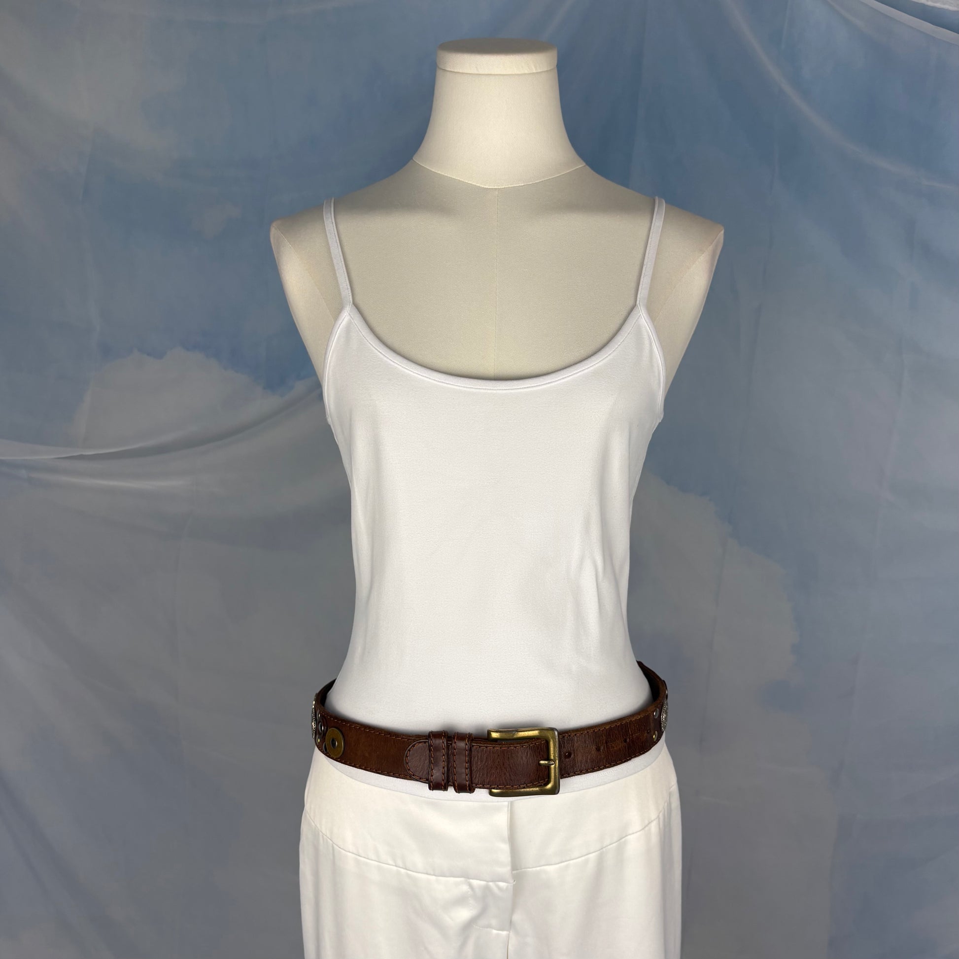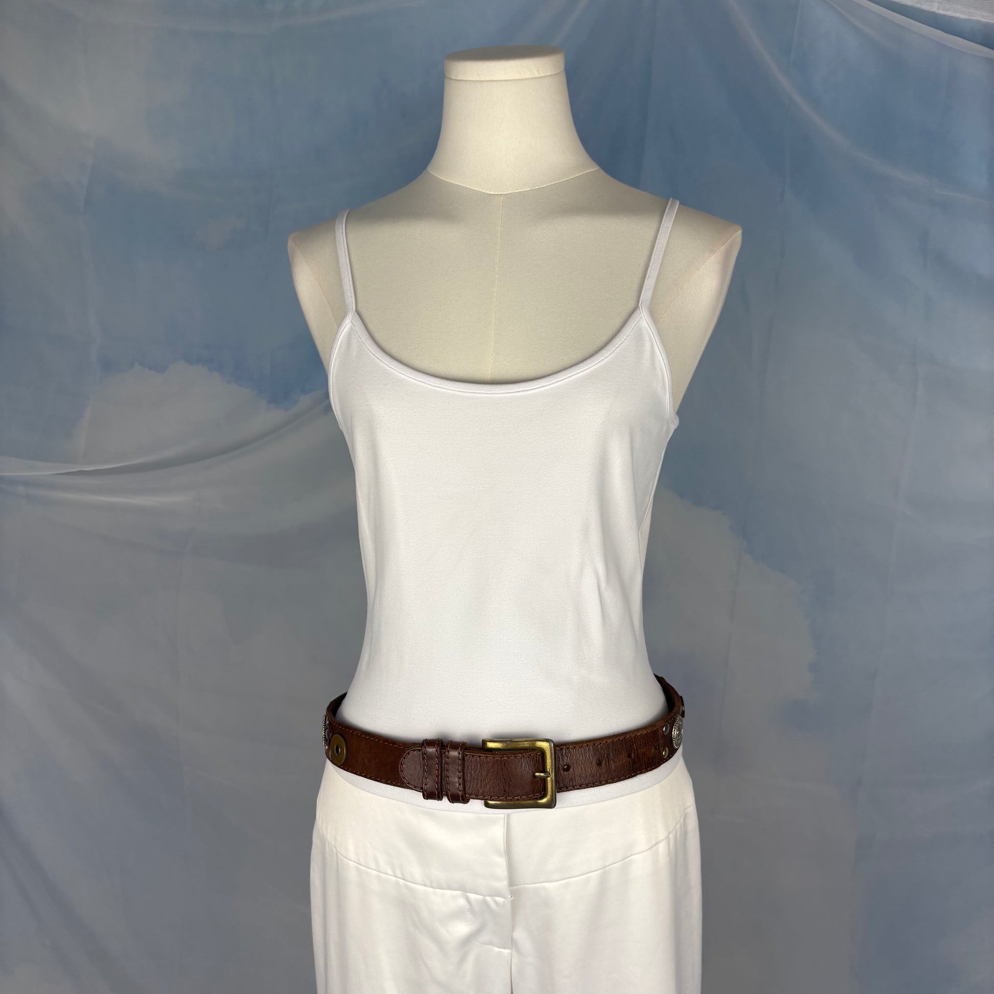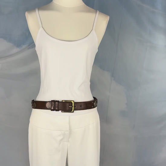 Brown Italian genuine leather belt with gold buckle. Detailed with an assortment of 1990s English and Hong Kong coins along with mixed metallic studs for a cool one of a kind feel.