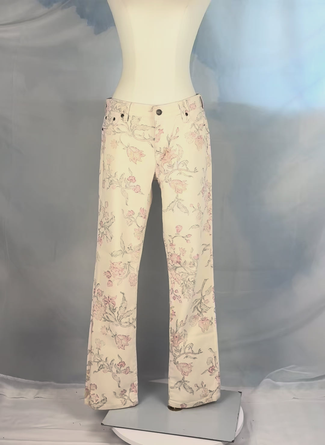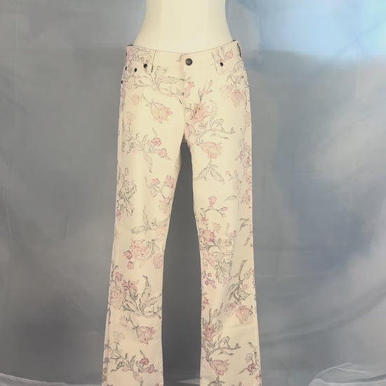 Ivory denim jeans with a soft multicolor floral print. Mid-rise with a modern straight leg. Features a zip fly with button closure and four functional pockets and a coin pocket.