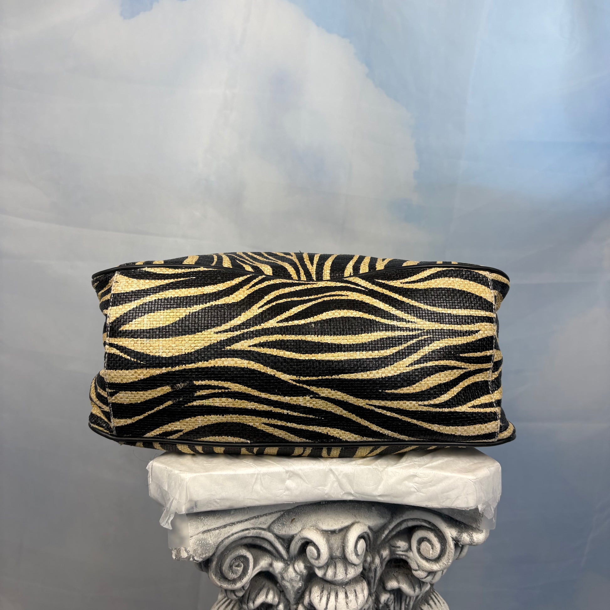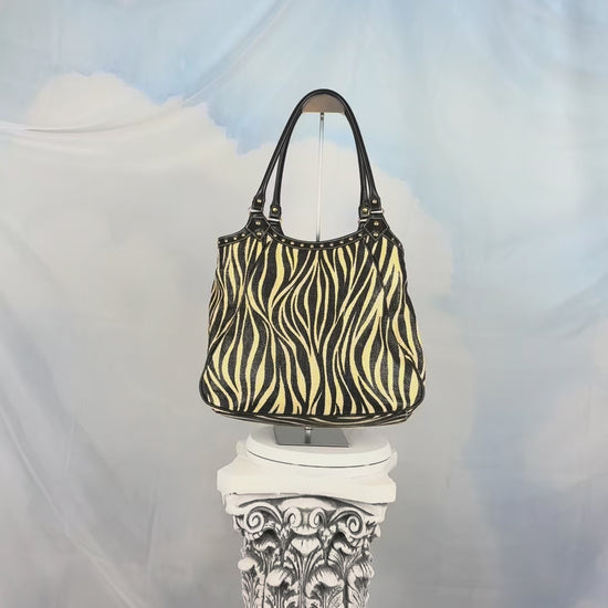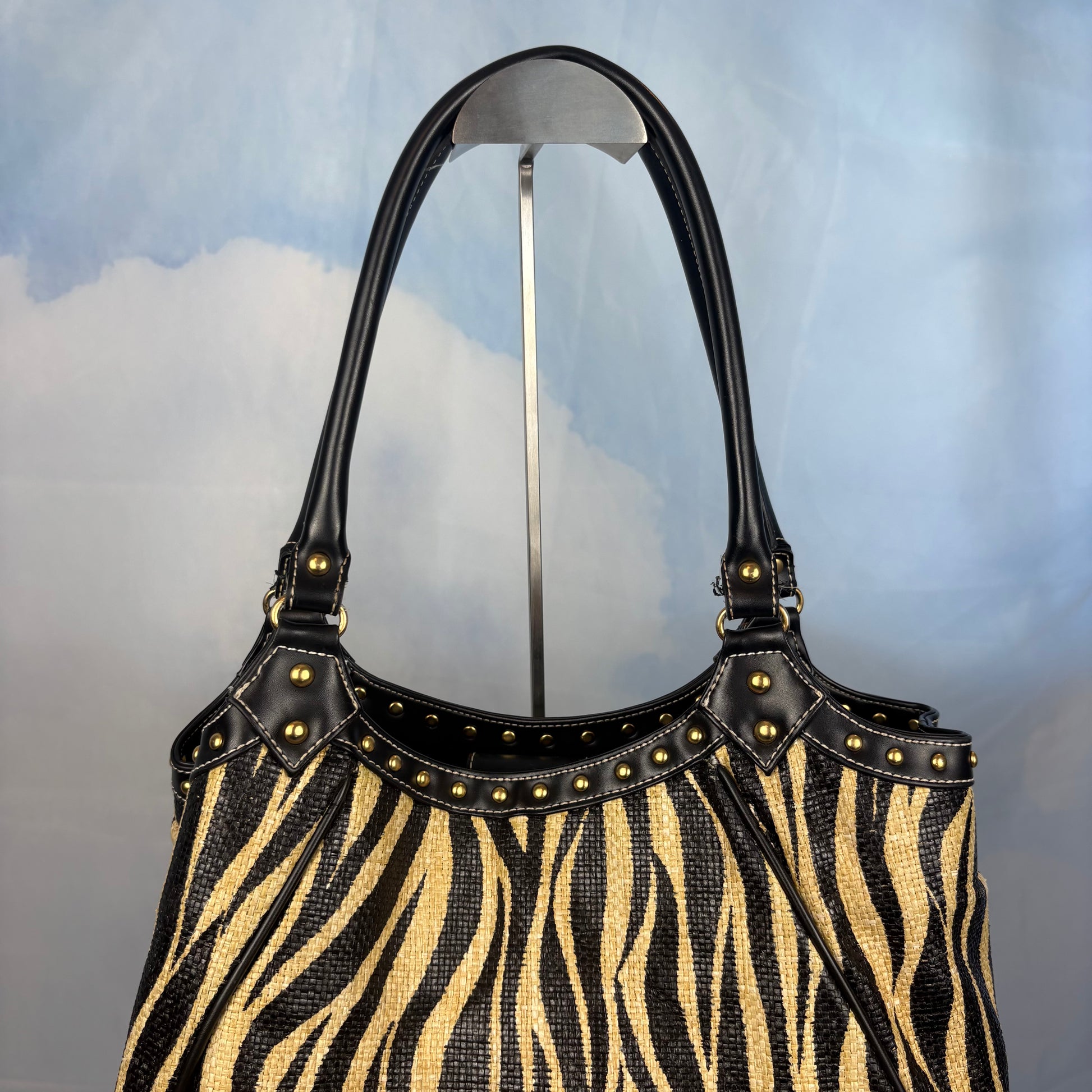 Abstract zebra print shoulder bag with dual straps, gold stud detailing, magnetic closure, and a divided interior featuring two compartments with a center zip pocket.