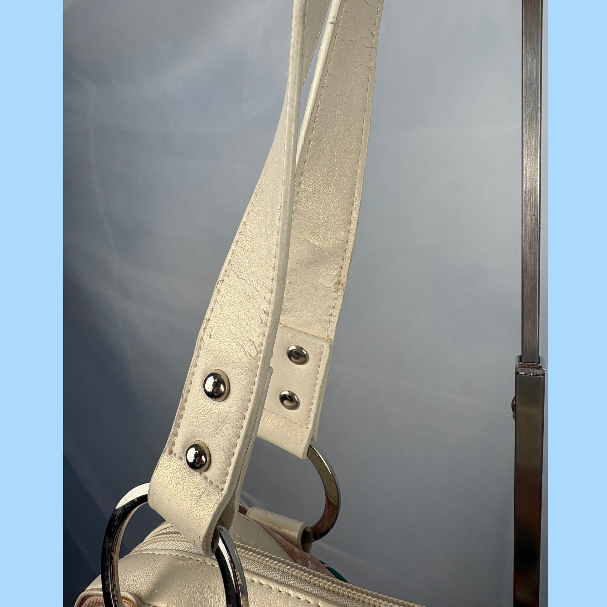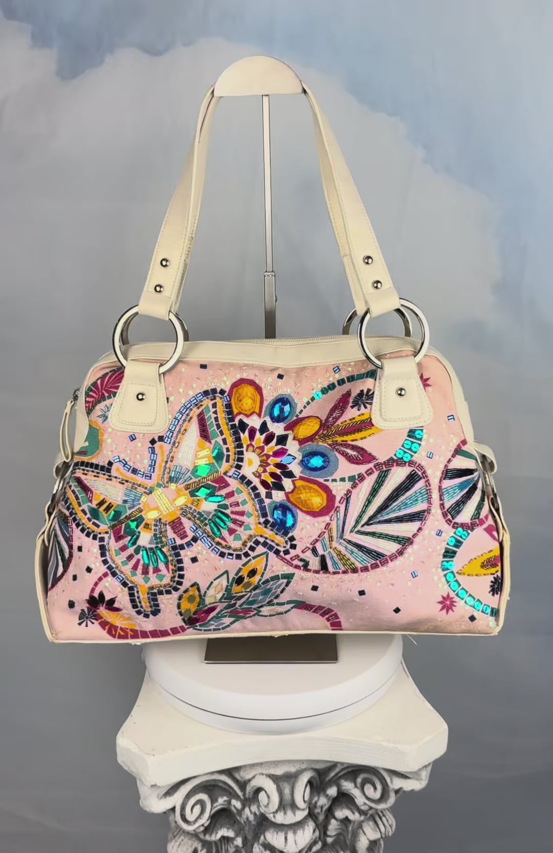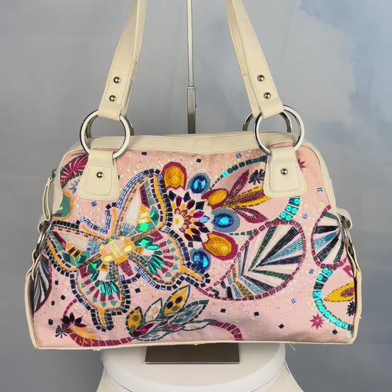 A beaded floral shoulder bag with a soft pink canvas body and white faux leather trim. Designed in Matthew Williamson's iconic butterfly motif with multicolor embellishments and beadwork. Finished with silver hardware, zipper top closure, and pink interior lining.