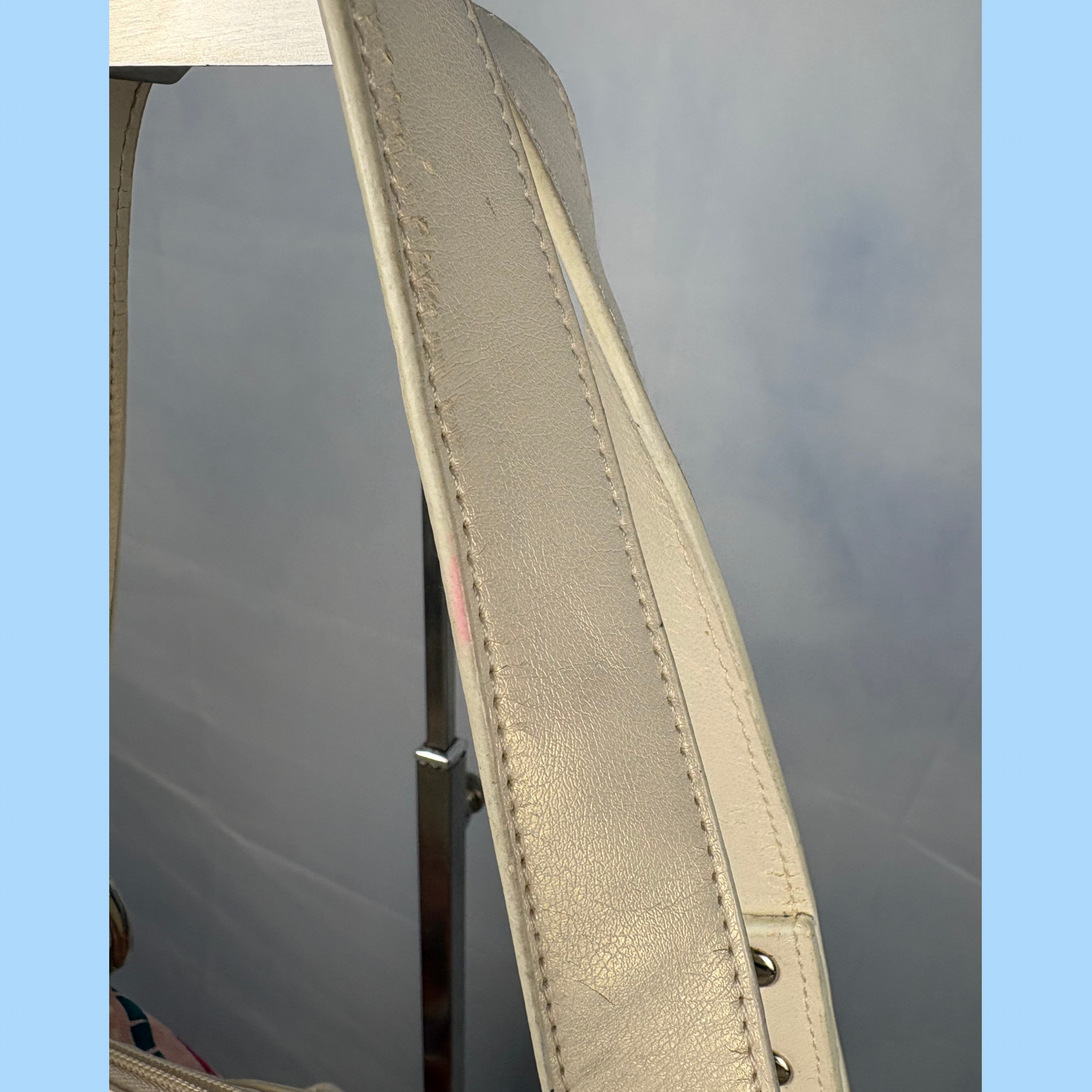 Condition: B (Good): Exterior canvas and embellishments remain in good condition. Faux leather trim and handles show visible wear, including cracking and peeling along edges and base. Interior lining is clean and in excellent condition. See photos for details.