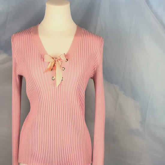 A ribbed silk-blend sweater with a delicate pink lace tie neckline, reminiscent of a classic ballerina wrap.