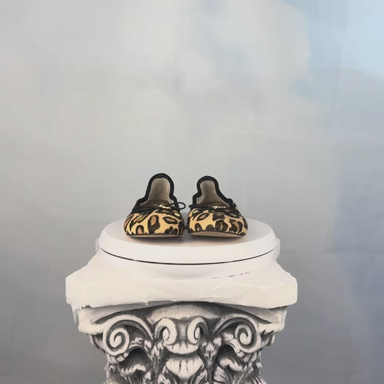 Elegant leopard print calf hair ballet flats with a classic rounded toe, accented by a feminine black bow detail and gold “SE” logo charm at the front.