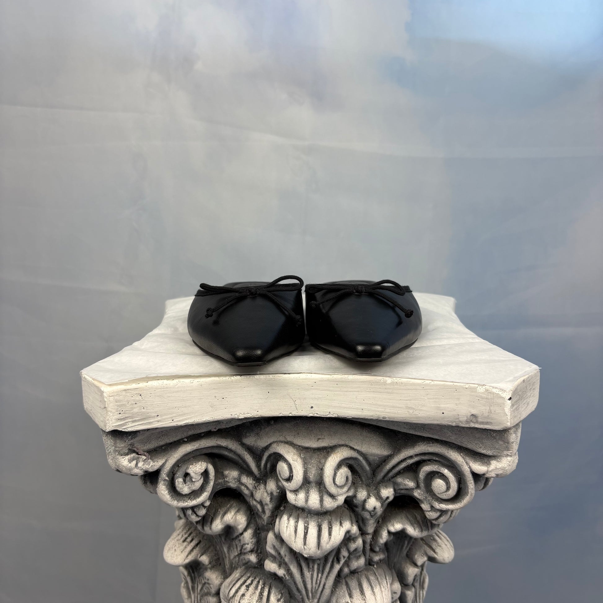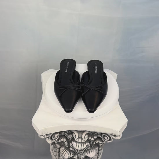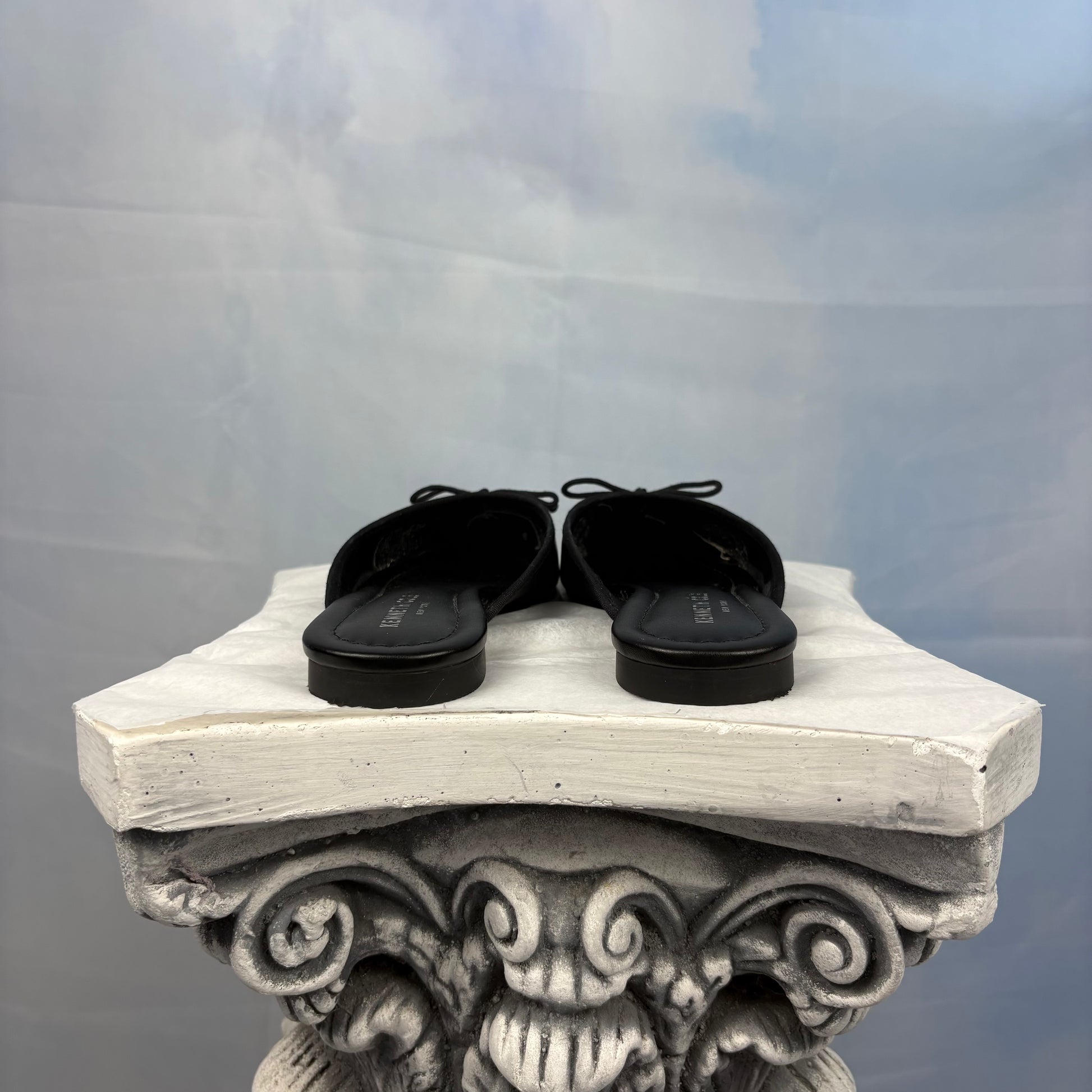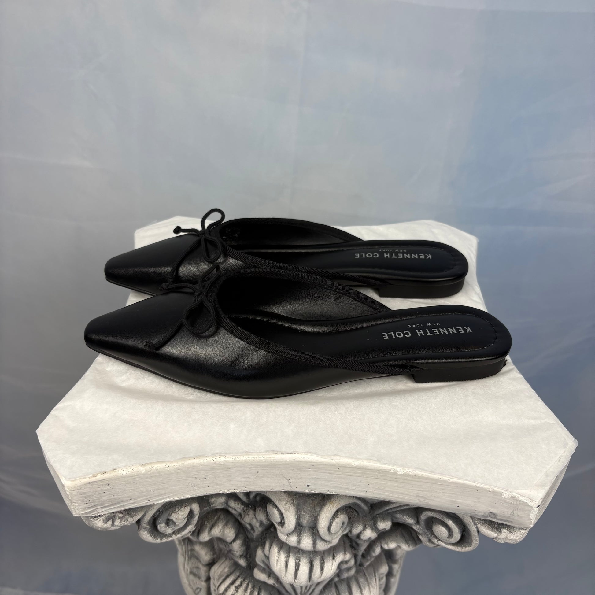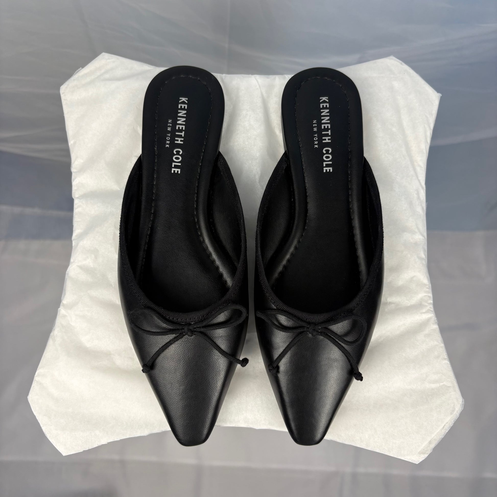 Black pointed toe mule flats with a minimalist bow accent and slip on design. Cushioned insole for comfortable wear. Retail price is $99. Classic, versatile, and easy to dress up or down.