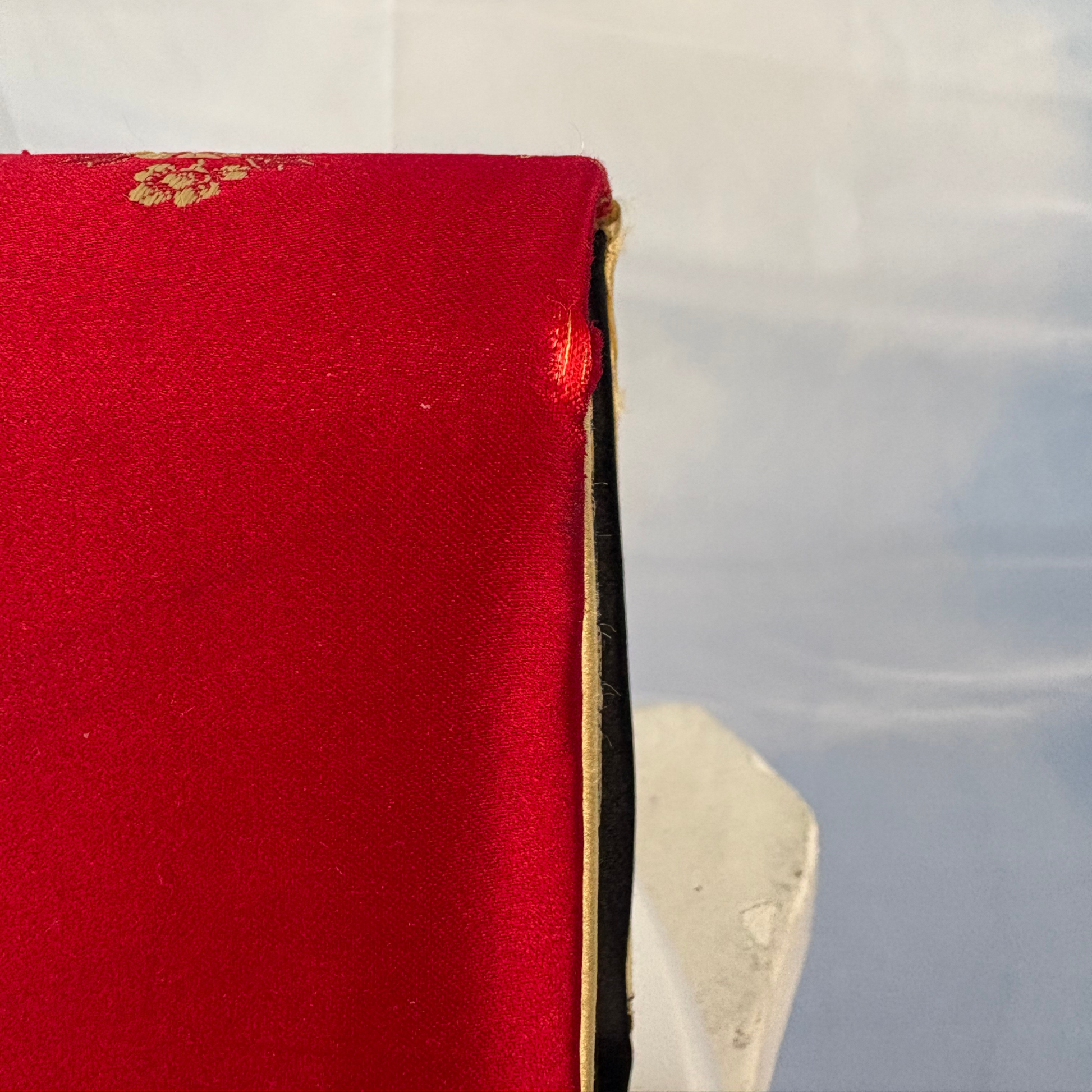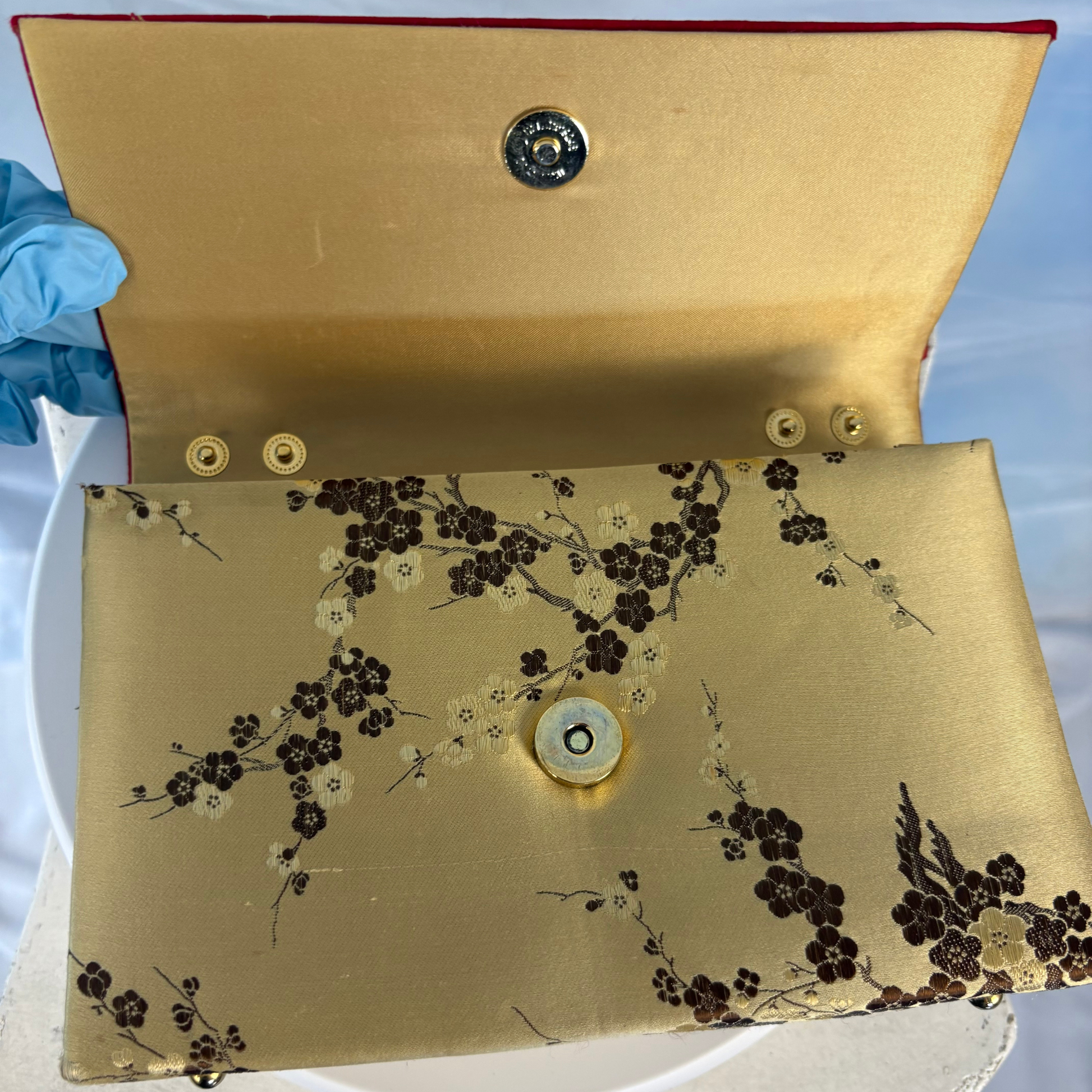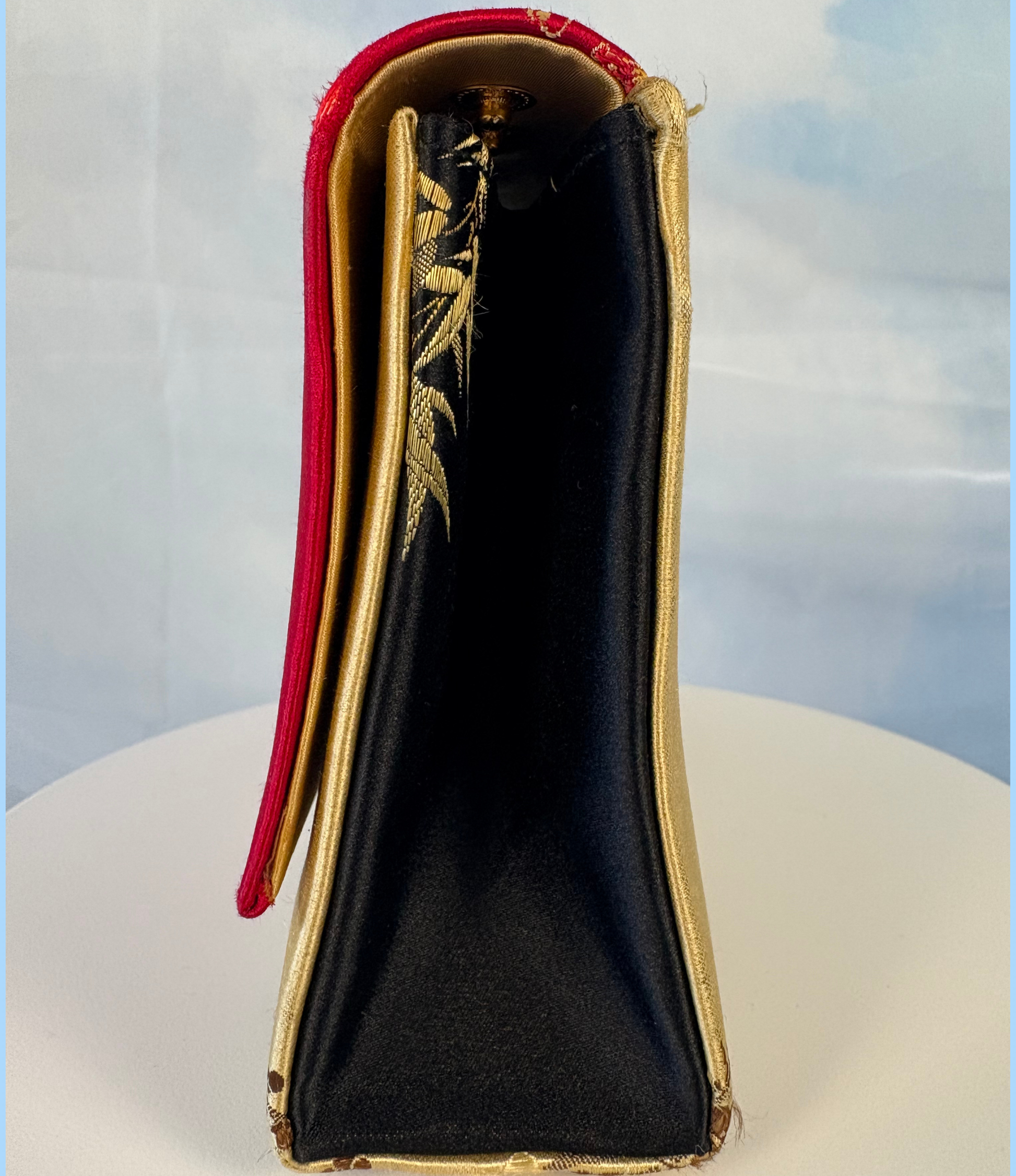 A stunning vintage clutch featuring a rich red satin exterior beautifully contrasting with a gold brocade based adorned with delicate floral motifs. The clutch opens to a gold satin-lined interior with a magnetic clasp closure and gold metal foot protectors.