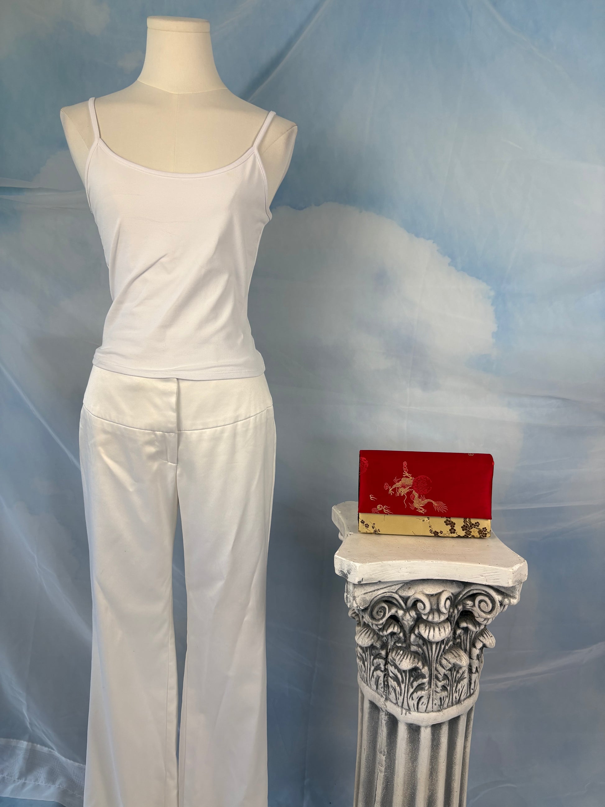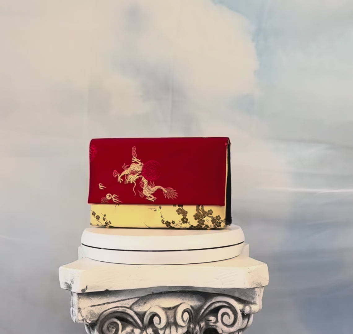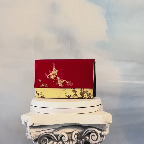 A stunning vintage clutch featuring a rich red satin exterior beautifully contrasting with a gold brocade based adorned with delicate floral motifs. The clutch opens to a gold satin-lined interior with a magnetic clasp closure and gold metal foot protectors.