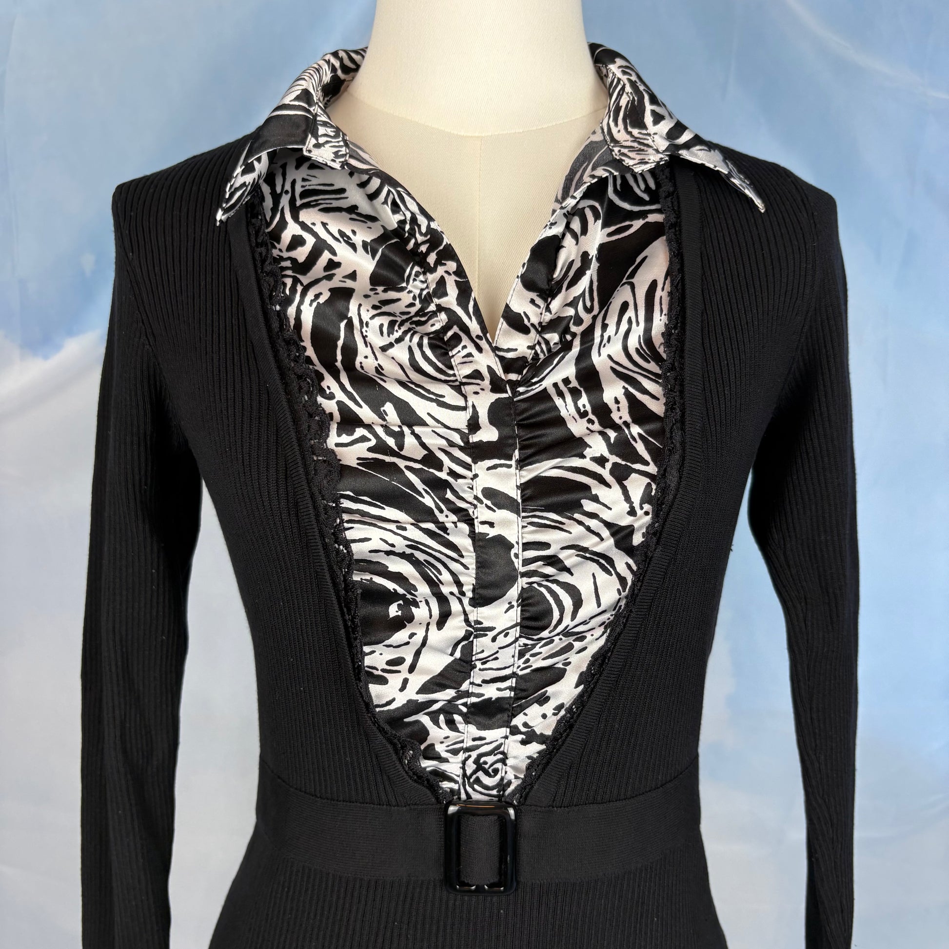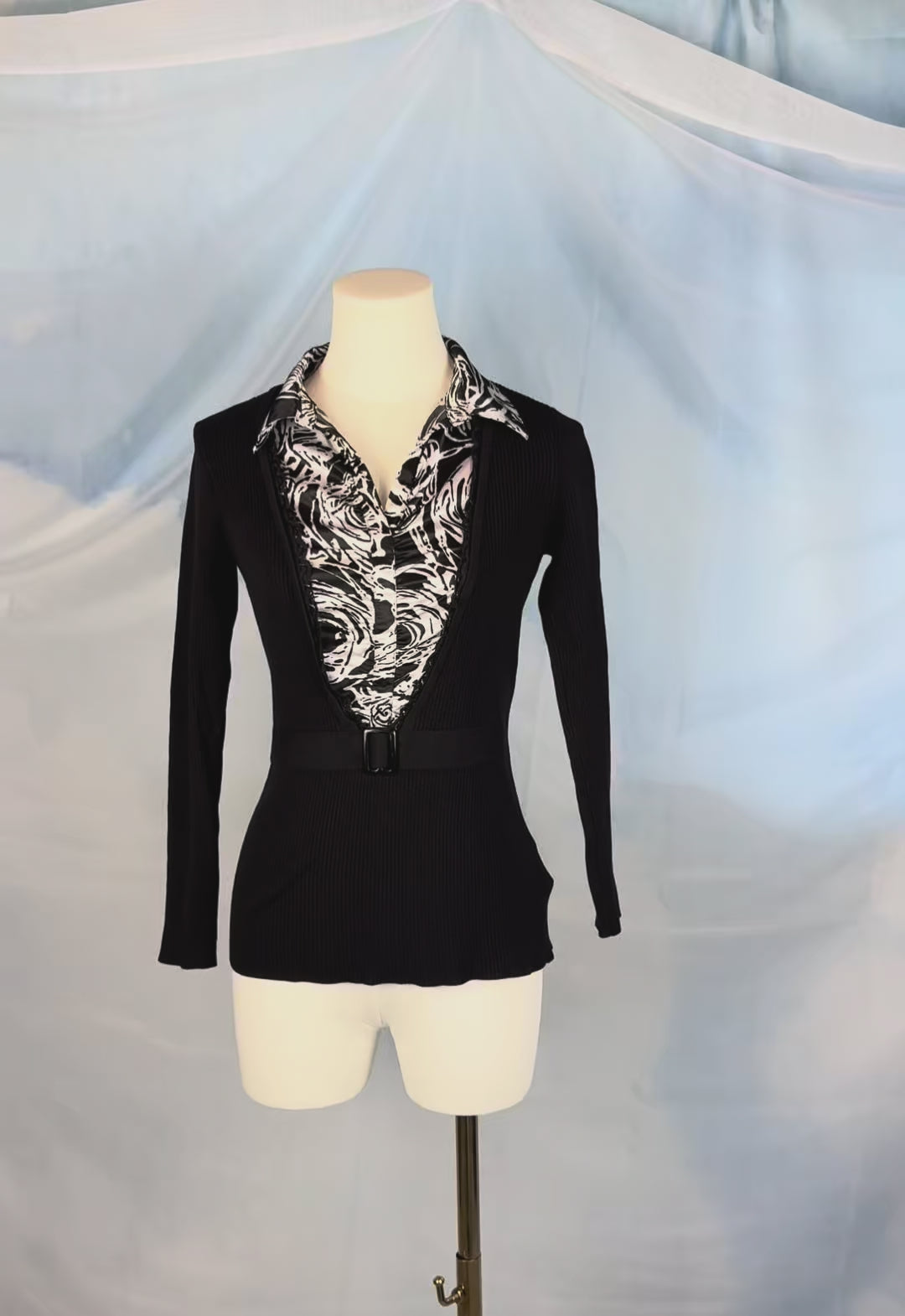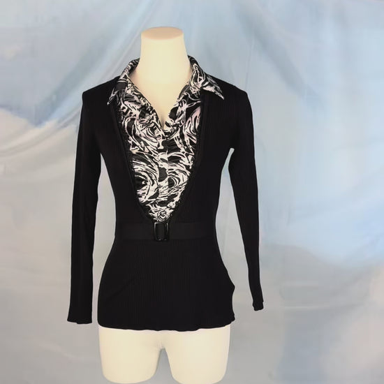 Slim-fit ribbed sweater with a collared neckline and striking black and white swirl print. Finished with a faux belted waist that adds cinches the waist for a flattering silhouette.