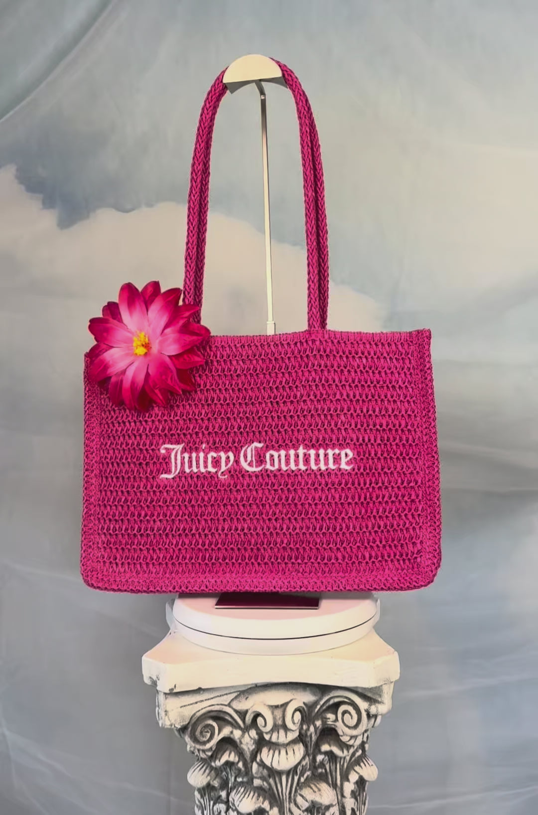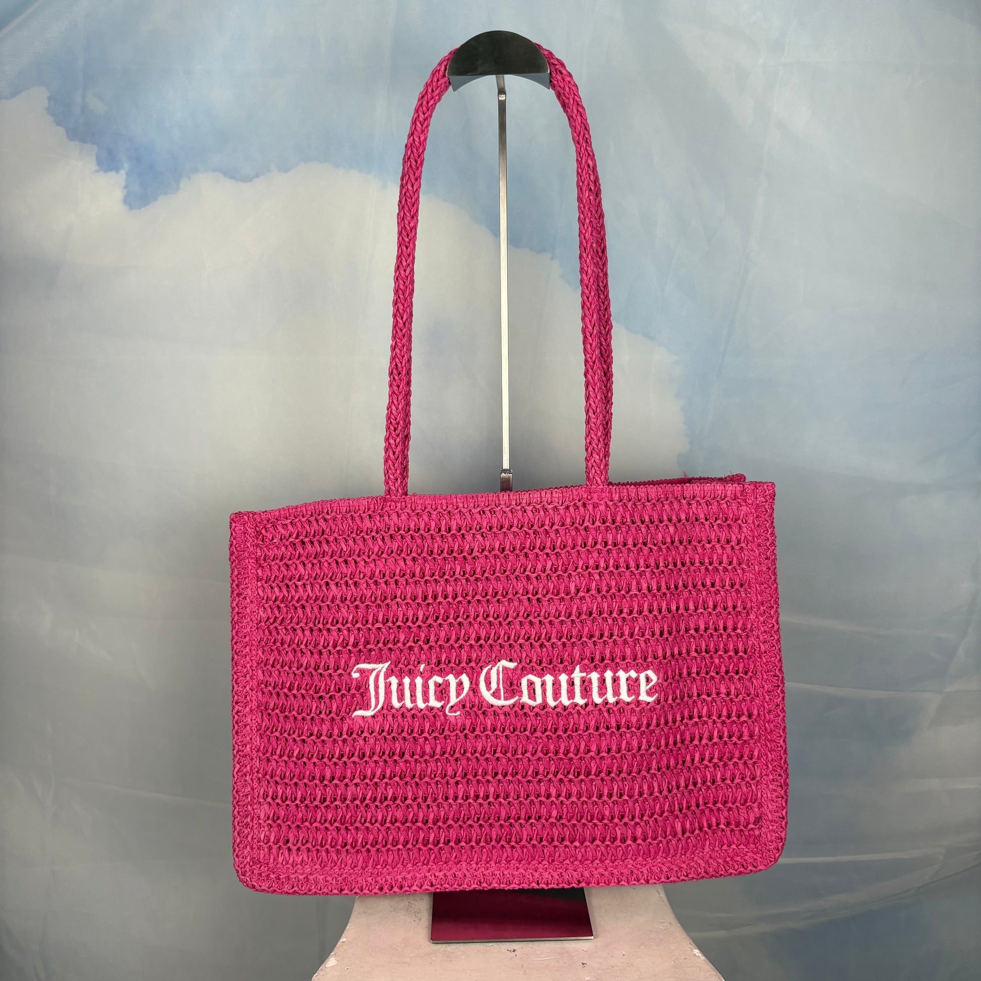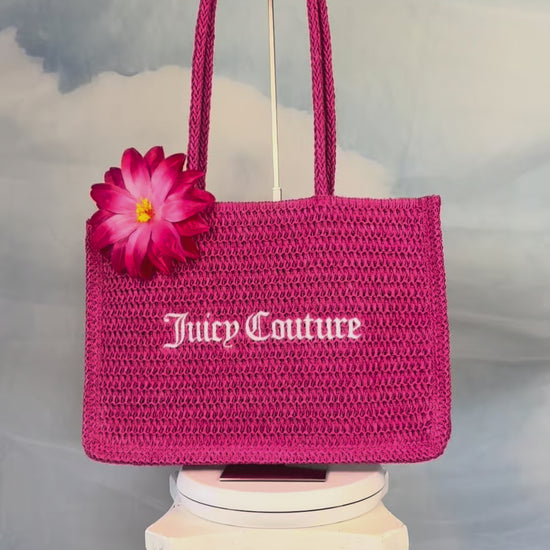 Pink woven straw tote with double handles. Easy and lightweight with a fun, nostalgic feel, perfect for summer days. About the Brand: Juicy Couture was founded in 1997 by Pamela Skaist-Levy & Gela Nash-Taylor and became a defining fashion label of the early 2000s, favored by celebrities.