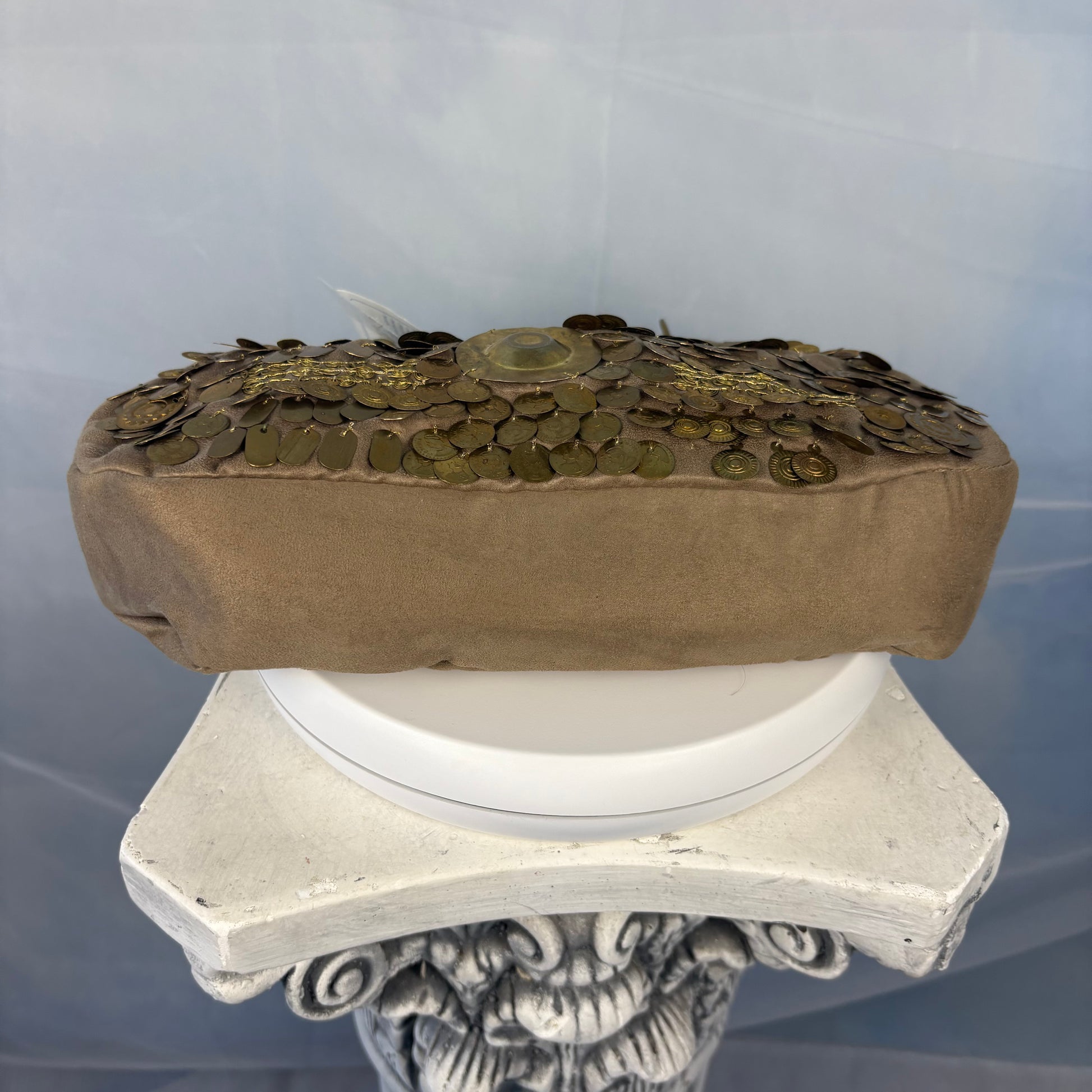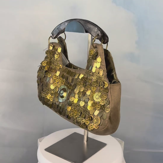 A sculptural handbag adorned with layered metal medallions that catch the light and move fluidly with the body. Grounded by a soft, suede-like base and finished with a curved handle, the piece balances ornament and form with striking presence.