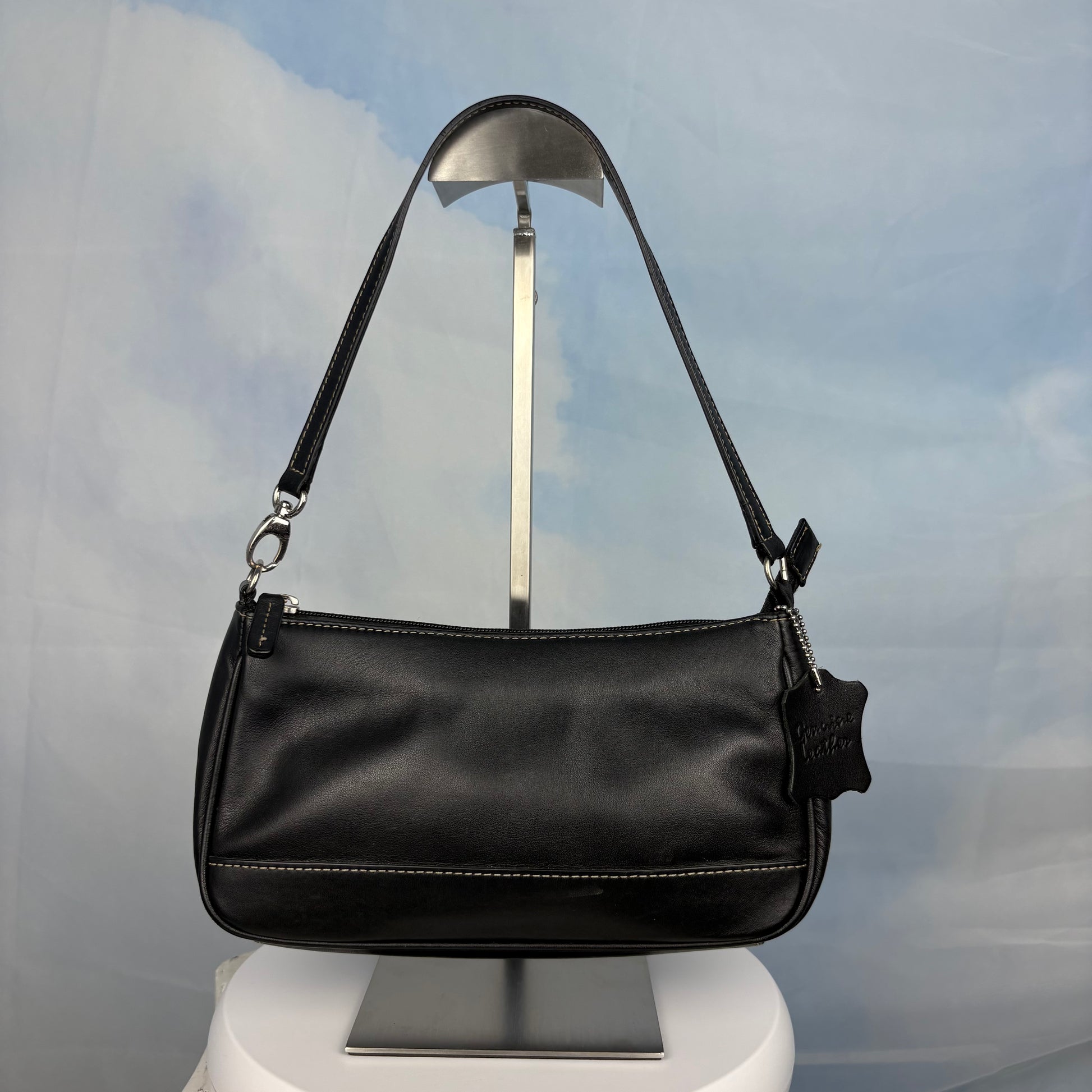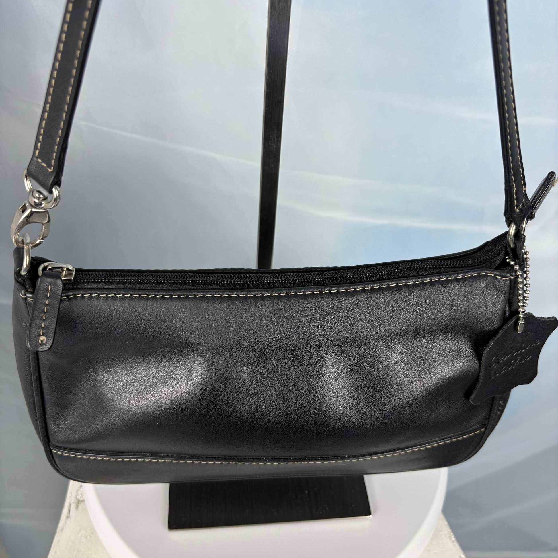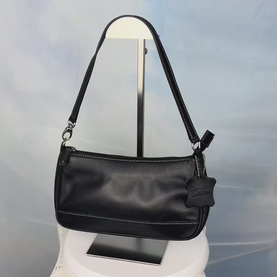 A sleek black leather bag with white contrast stitching, a zip closure, and a single detachable strap. Slim and structured, it's designed for easy everyday wear with a clean look.