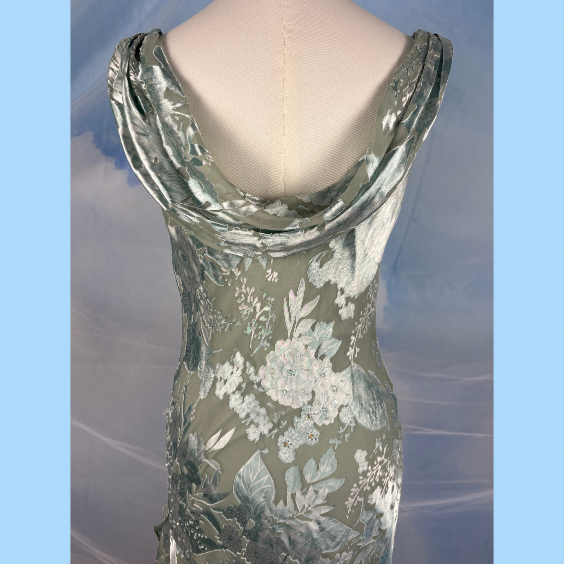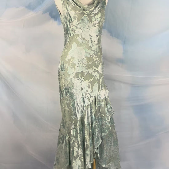 A gorgeous gown featuring a soft cowl neckline, body-skimming silhouette, and cascading ruffle hem for beautiful movement. Embodies Y2K elegance, perfect for any formal occasion.