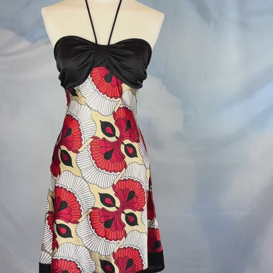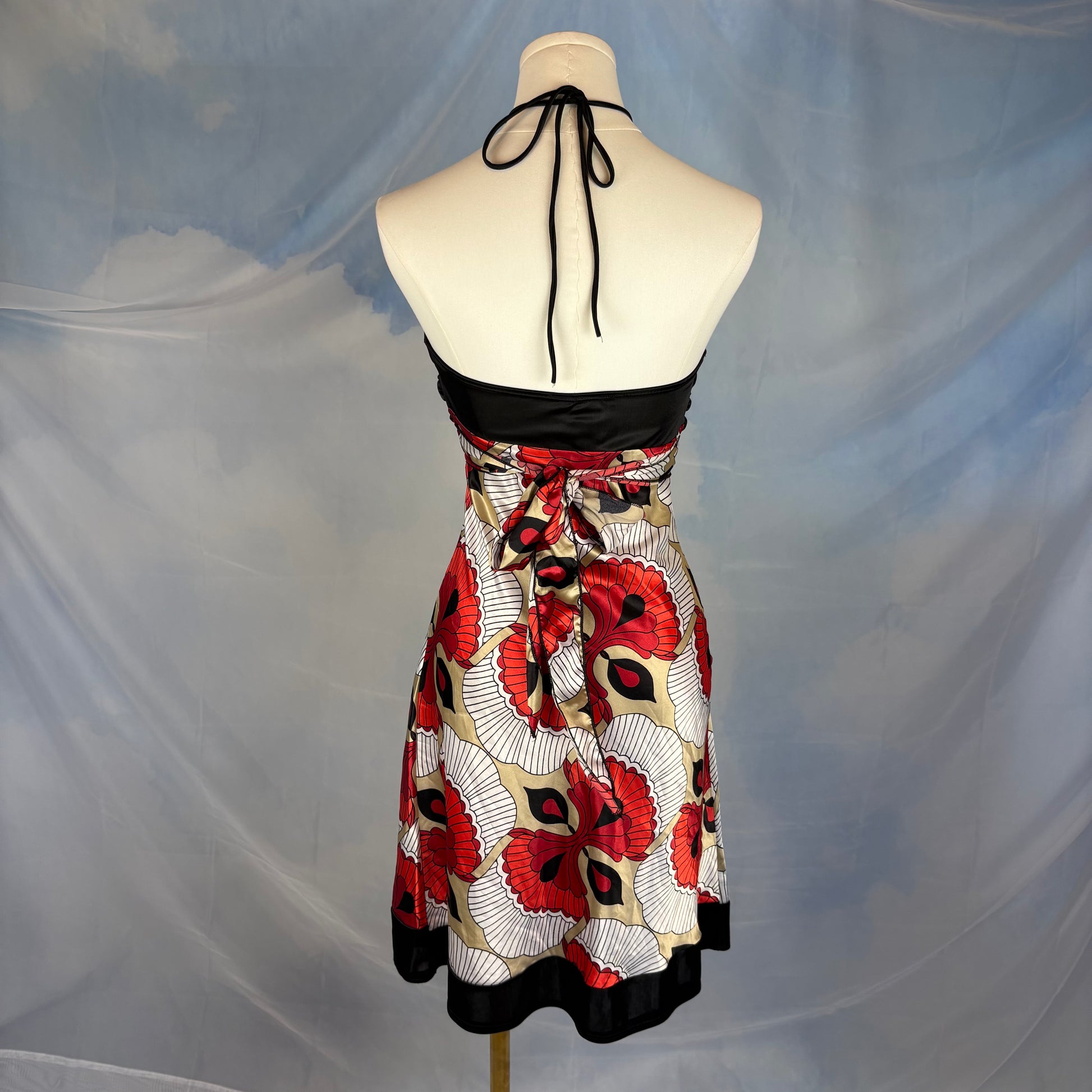 Strapless halter dress featuring a black ruched bust with adjustable neck tie closure. Wide self-tie sash at the back for adjustable fit and shaping.