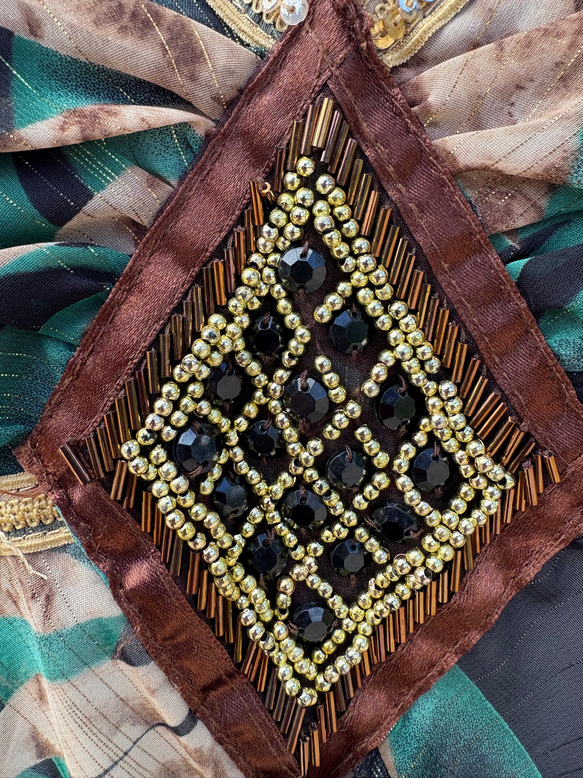 Condition: A- (Great): Some minimal loose beading on the decorative panel, and a few missing sequins along the center line as shown in photos 4 & 5.