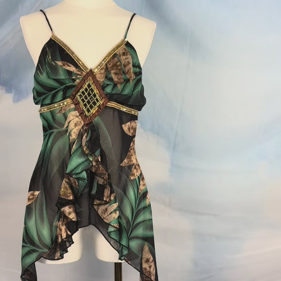 This handkerchief-hem camisole top with a mixed tropical & abstract print and beaded diamond center detail, is the epitome of 2000s fashion.