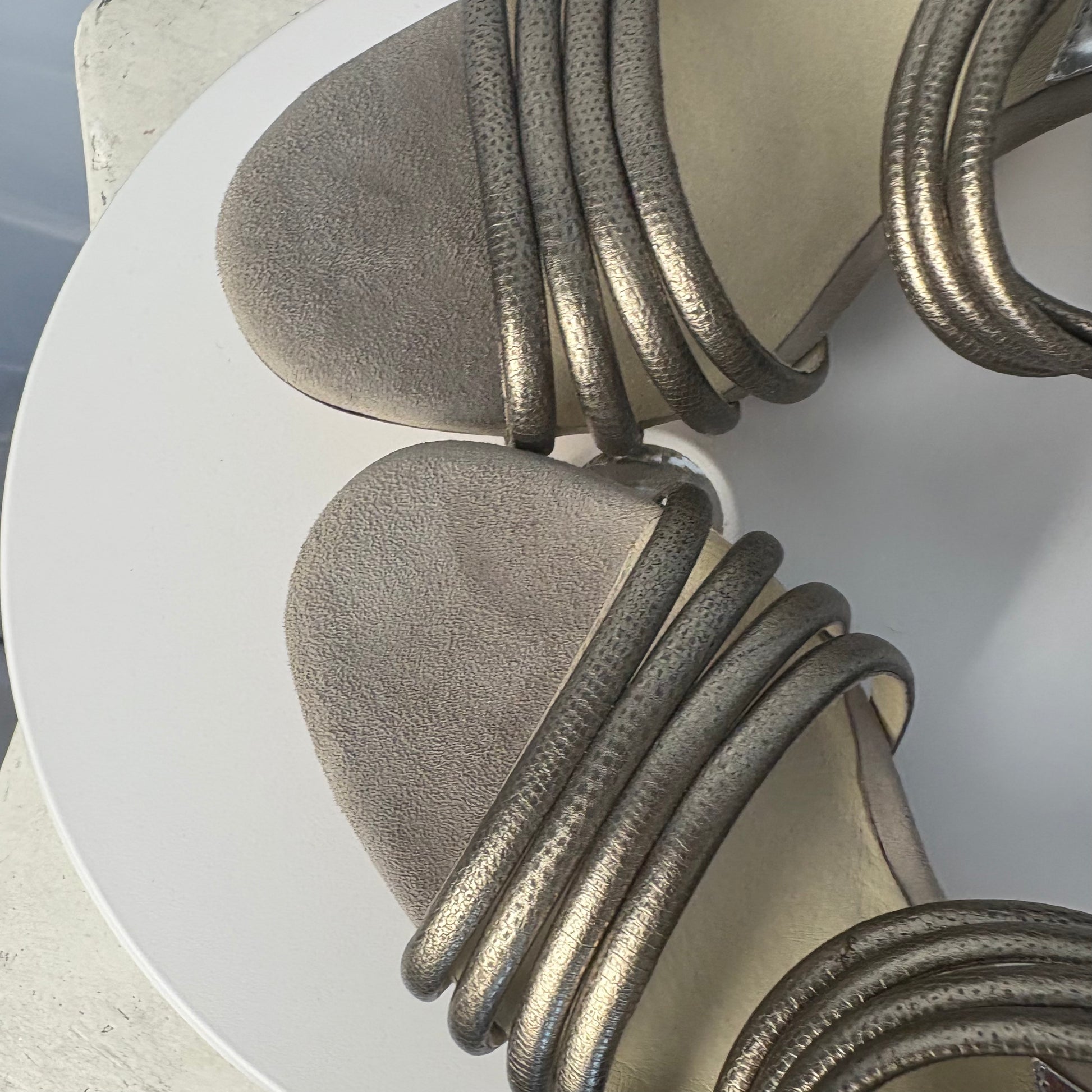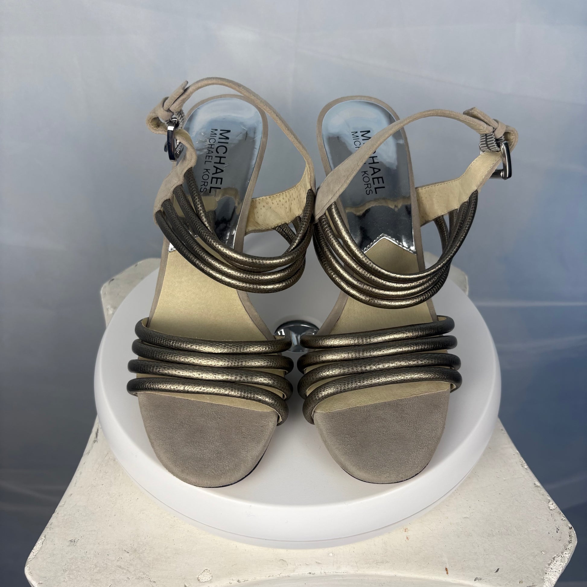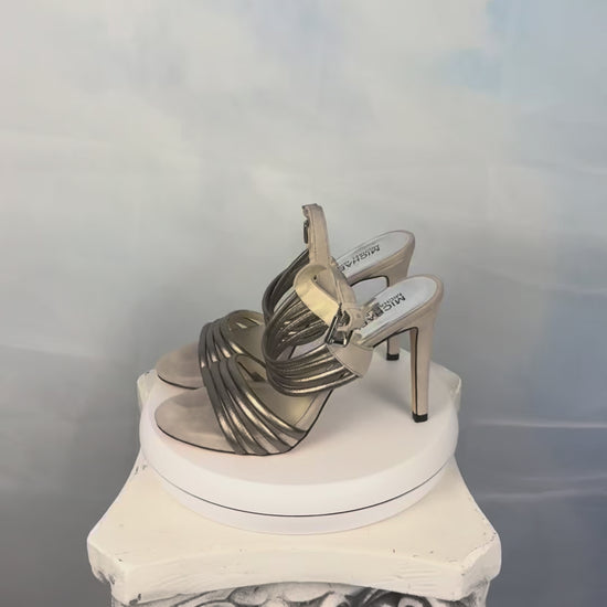 Taupe suede and metallic leather 4-inch heels with a slim high heel and adjustable ankle strap. Clean, elegant design with subtle texture and shine.