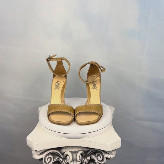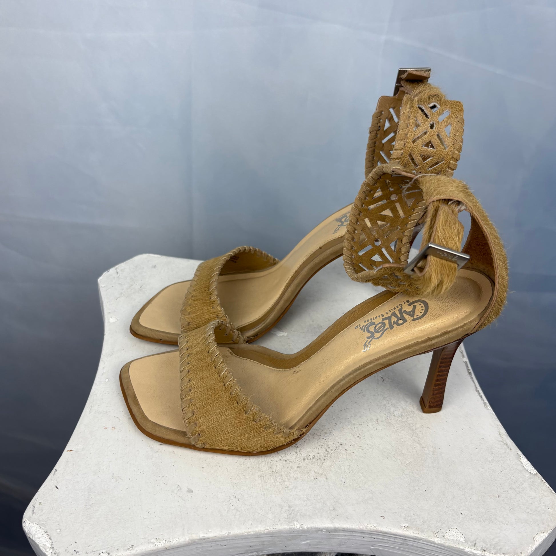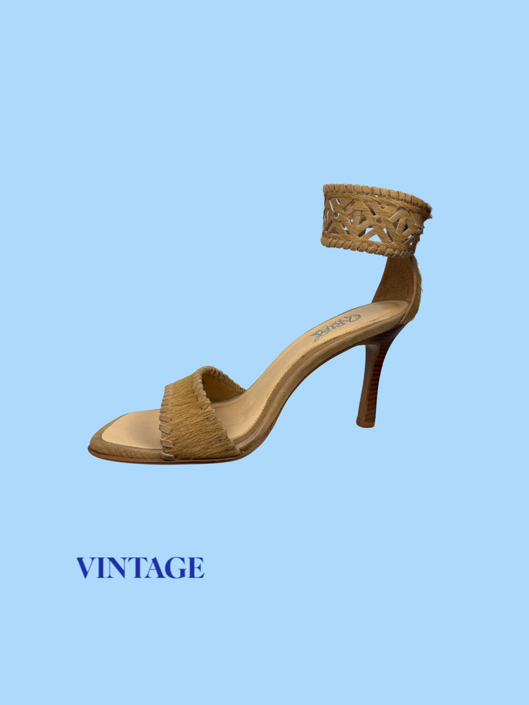 Tan square-toe heels crafted in genuine calf hair leather and intricate laser cut ankle cuffs. Finished with a slim wood-grain 4 inch stiletto heel.