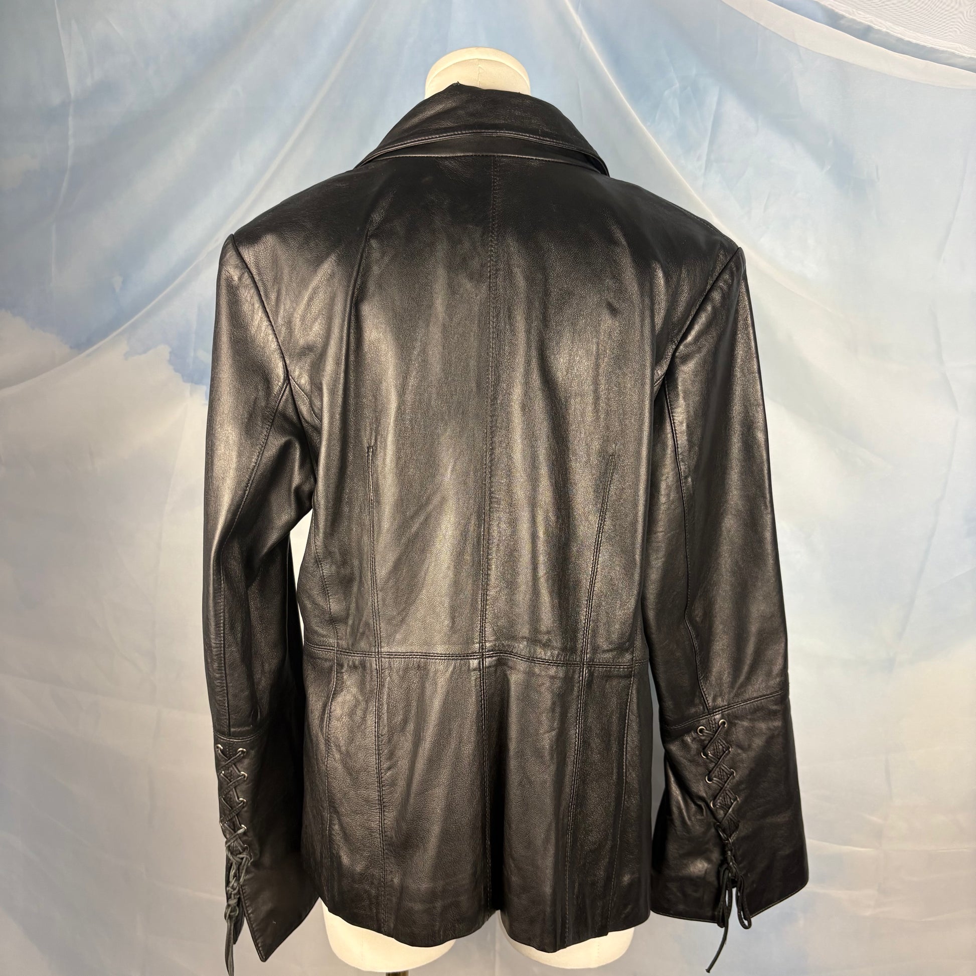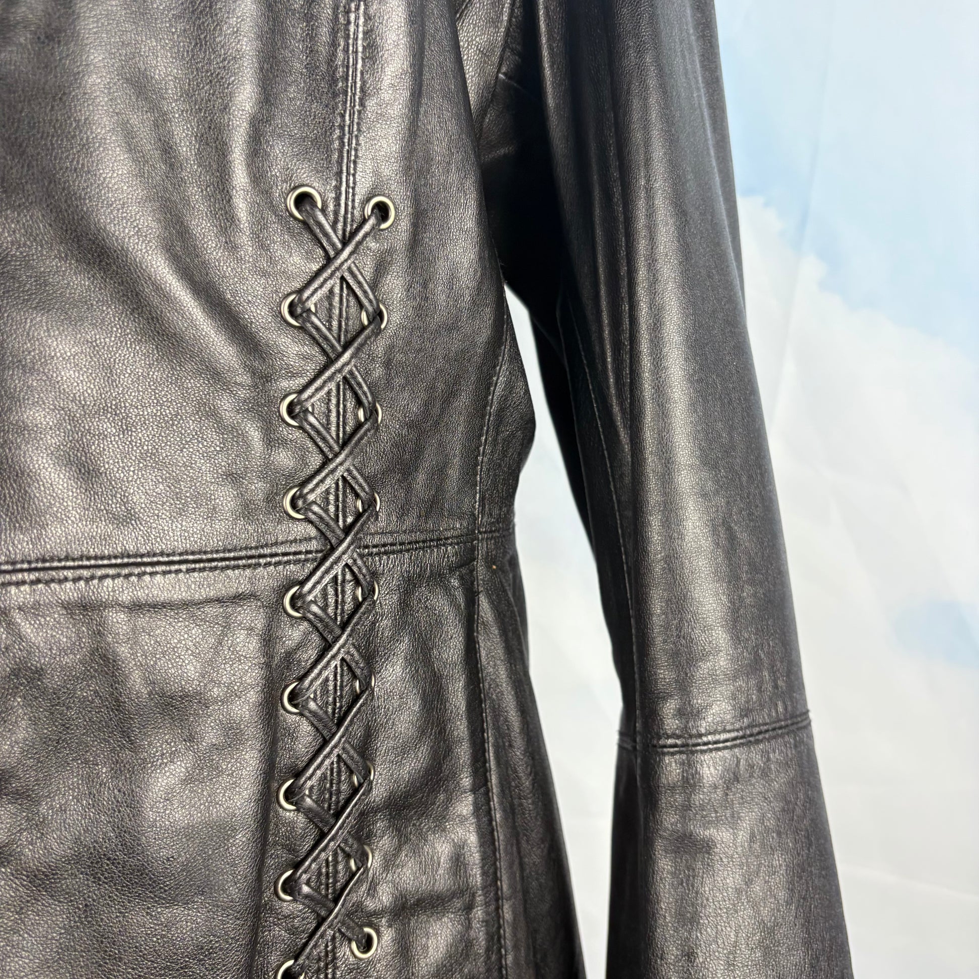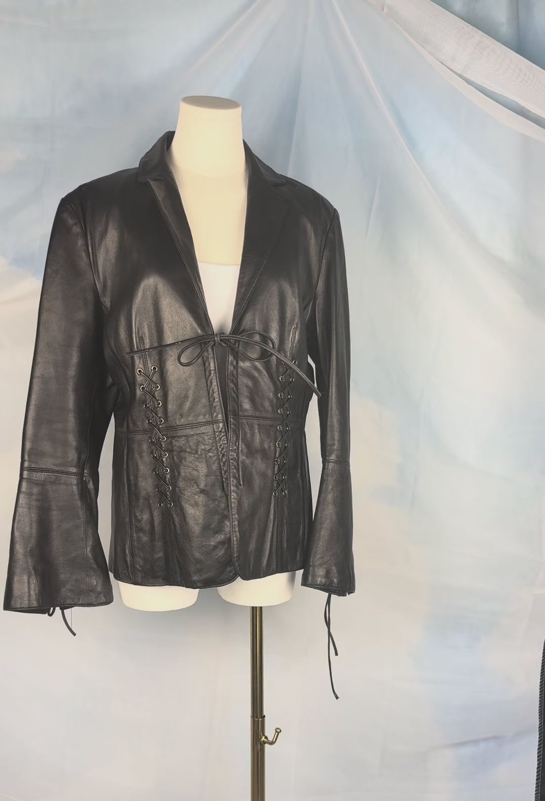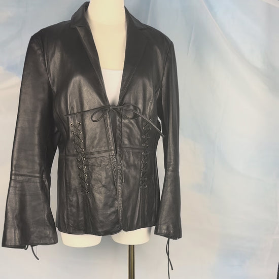 A stunning black leather jacket defined by lace-up detailing at the sides and along the back of the flared sleeves. Finished with an open neckline and front tie, balancing structure with softness.