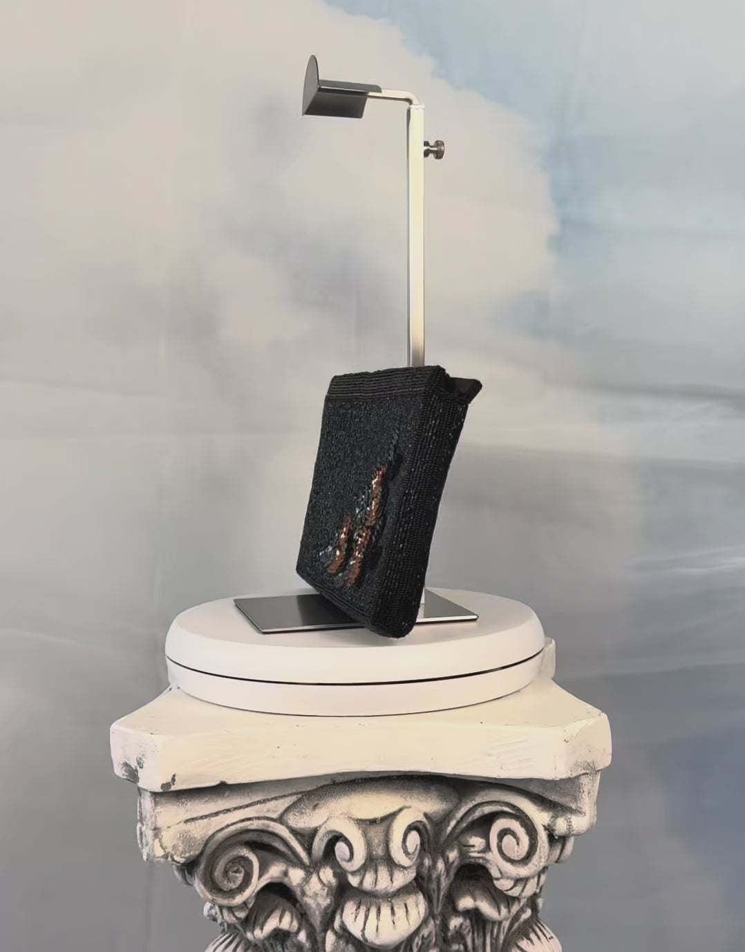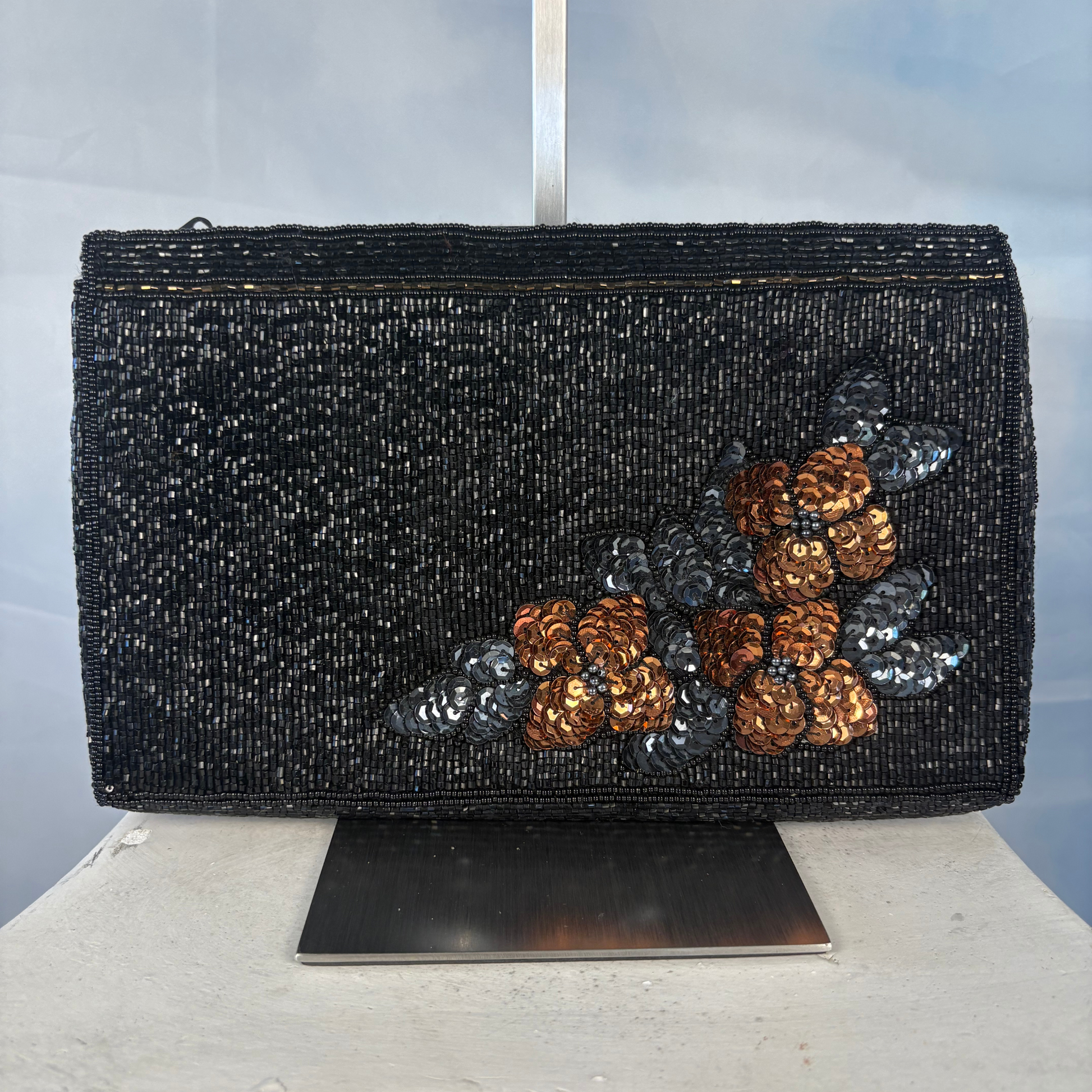 A rare sample piece, this clutch showcases beautiful early production detailing. The exterior is covered in beads and sequins, forming a subtle floral motif.