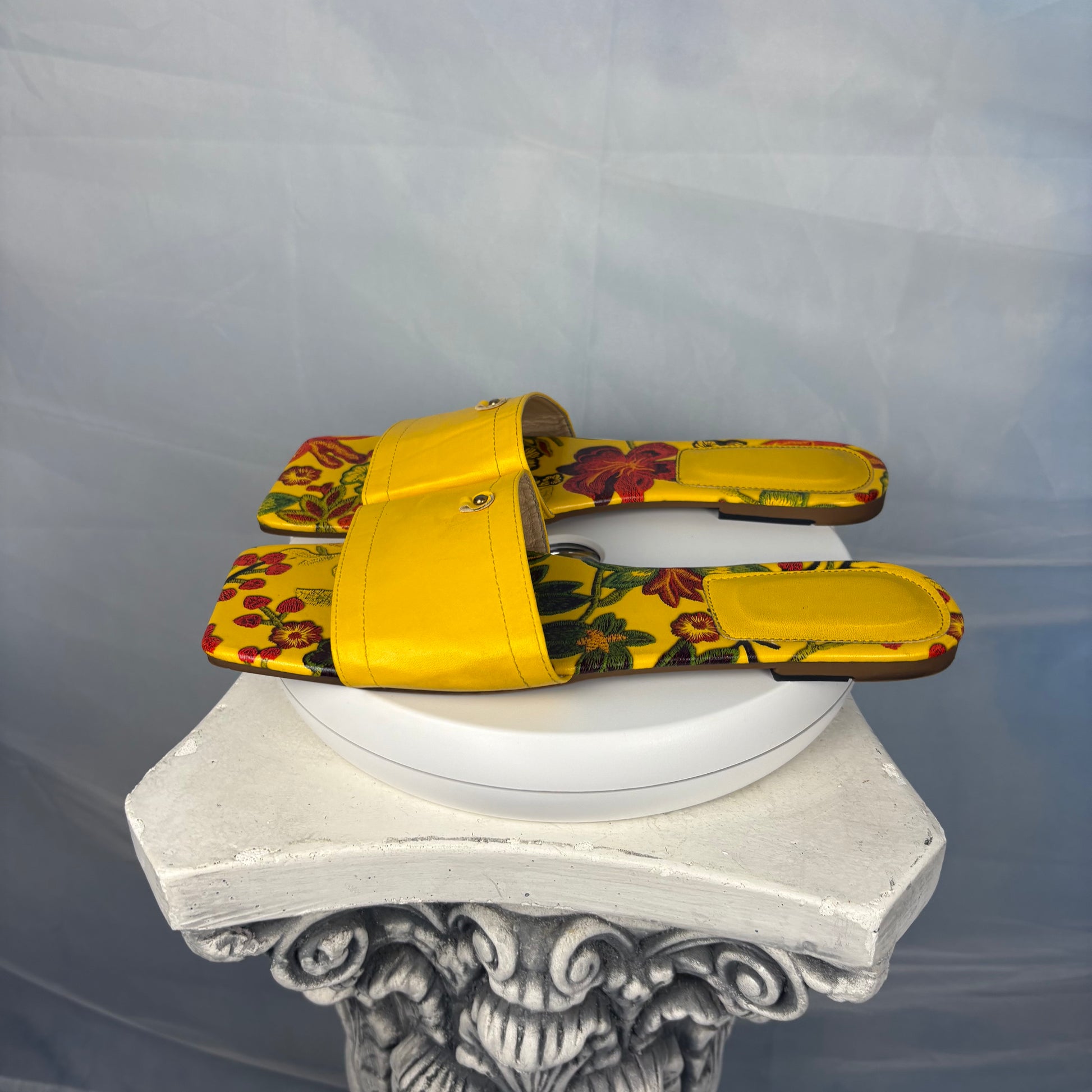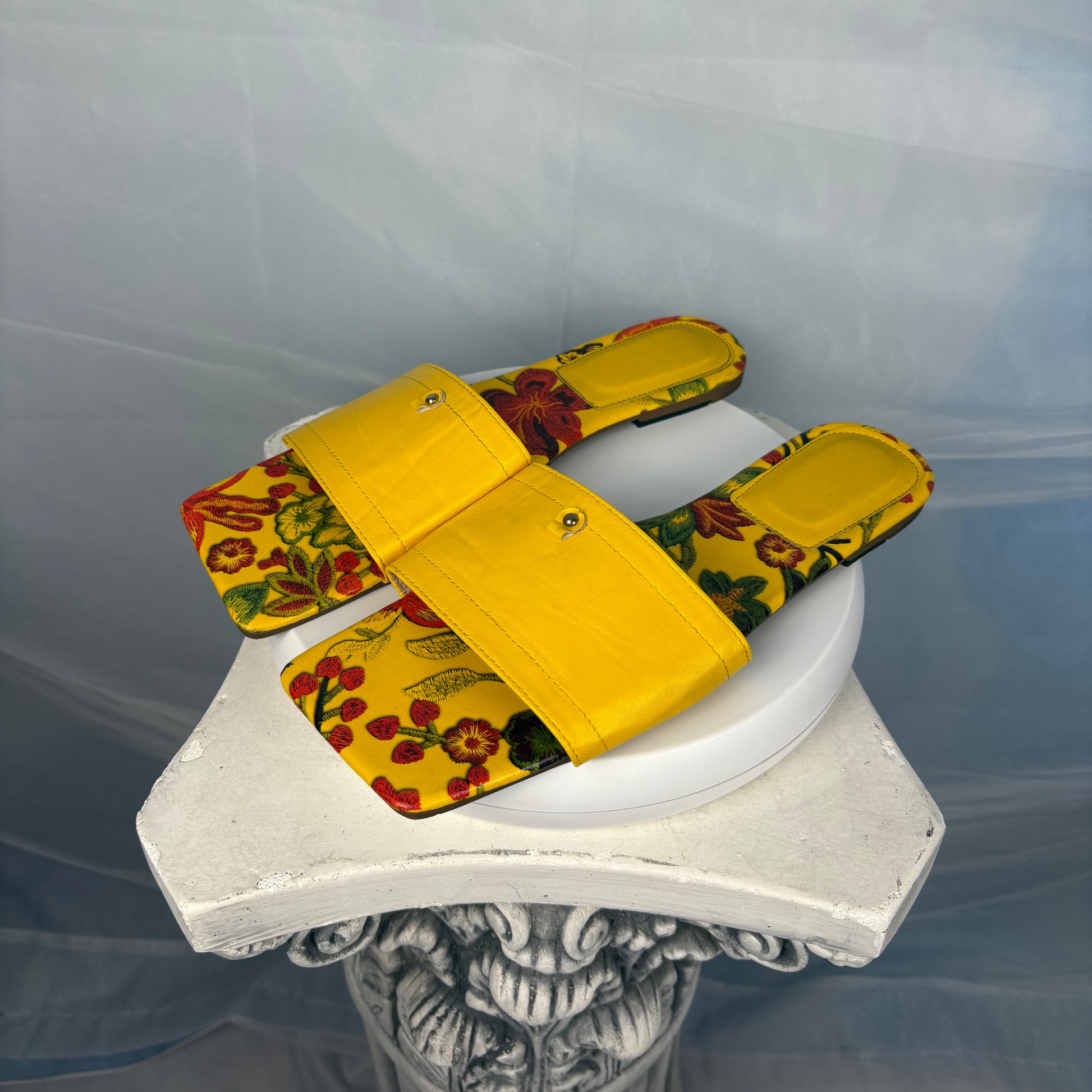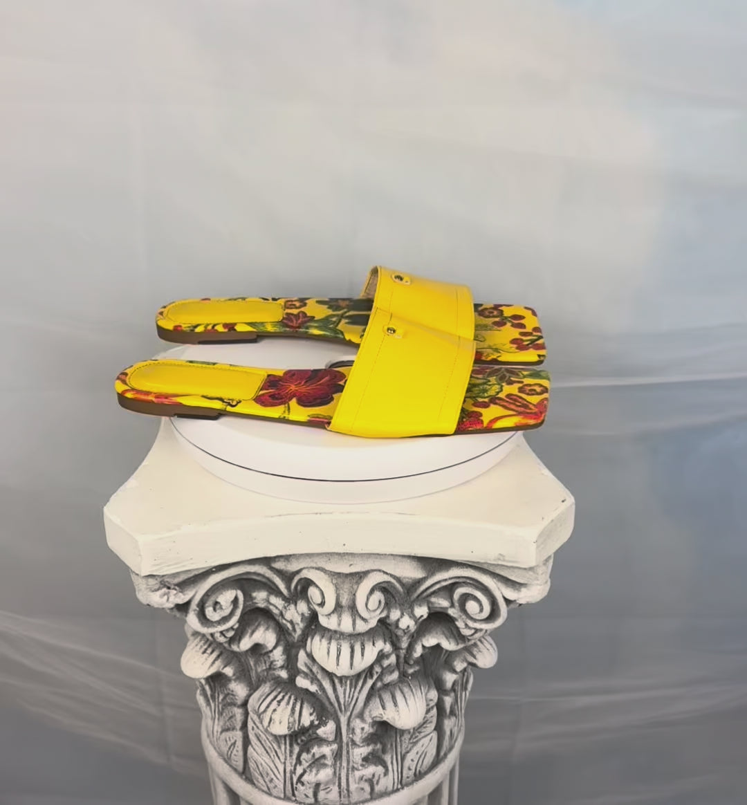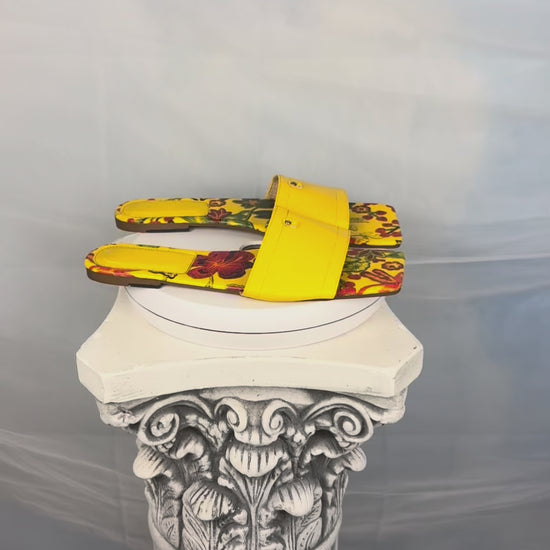 Floral mules in a vibrant golden-yellow hue. Open-back design with a wide smooth upper and printer floral footbeds. Flat sole with a structured silhouette. Note: Brand is not indicated on the item.