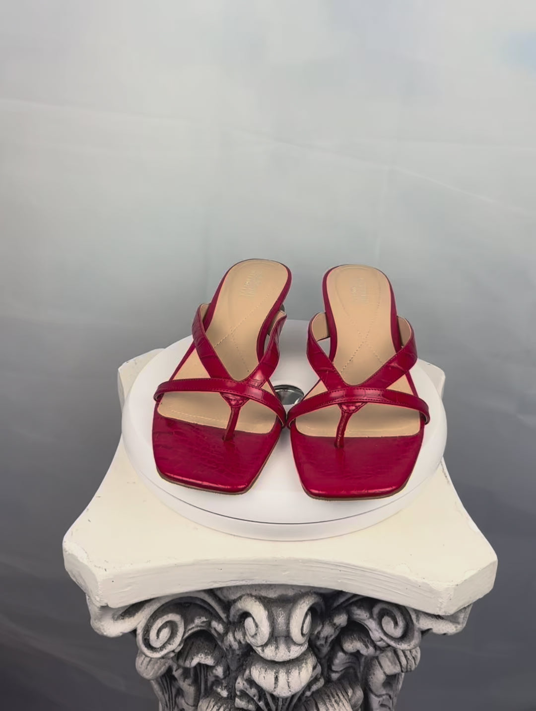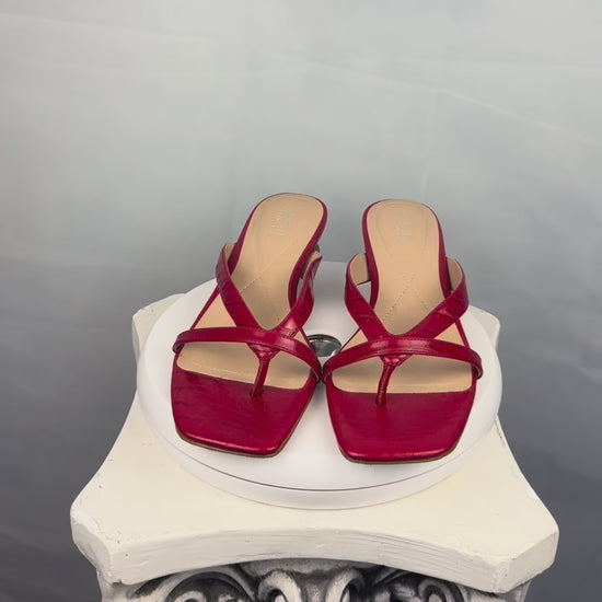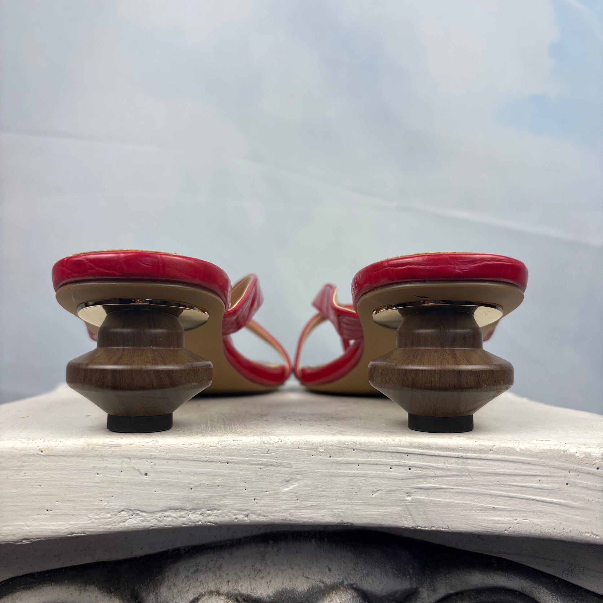 Square toe red heels with a crocodile embossed texture and crisscross straps. Finished with a unique wooden sculptural heel.