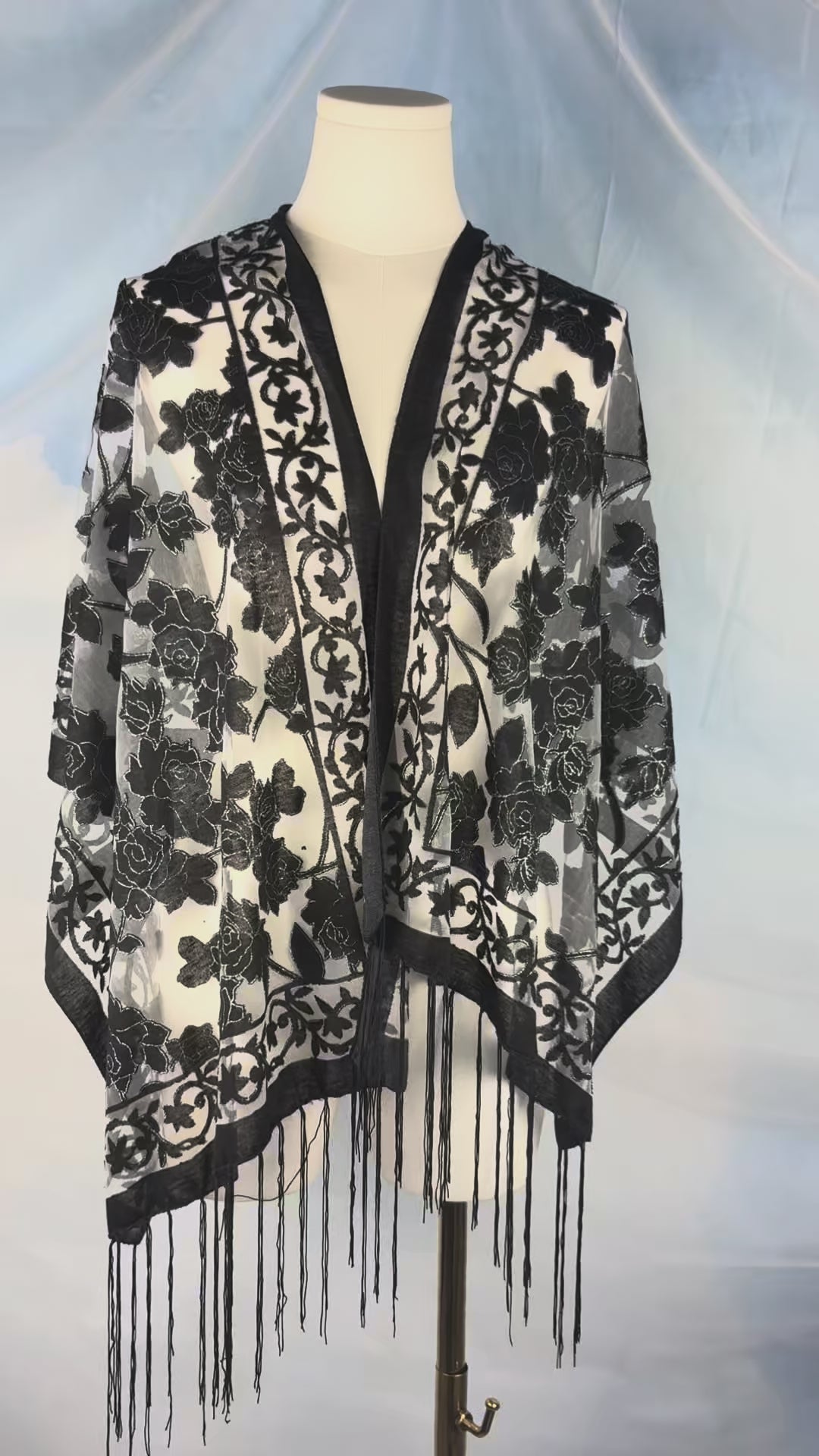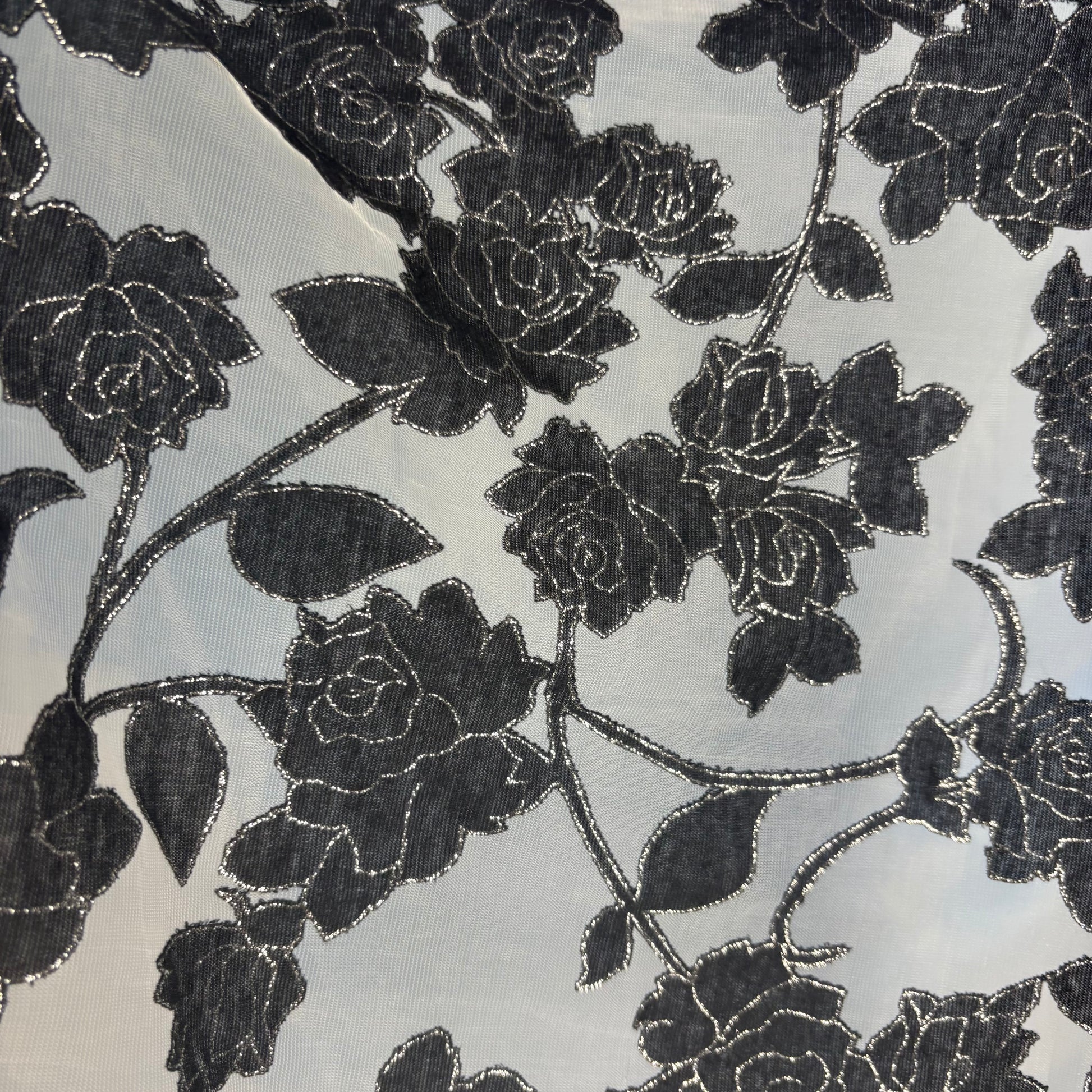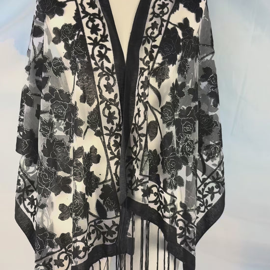 A sheer, lightweight scarf finished with black floral detailing and subtle silver shimmer tracing the outlines of each motif. This piece catches the light beautifully and adds depth and movement to any look.