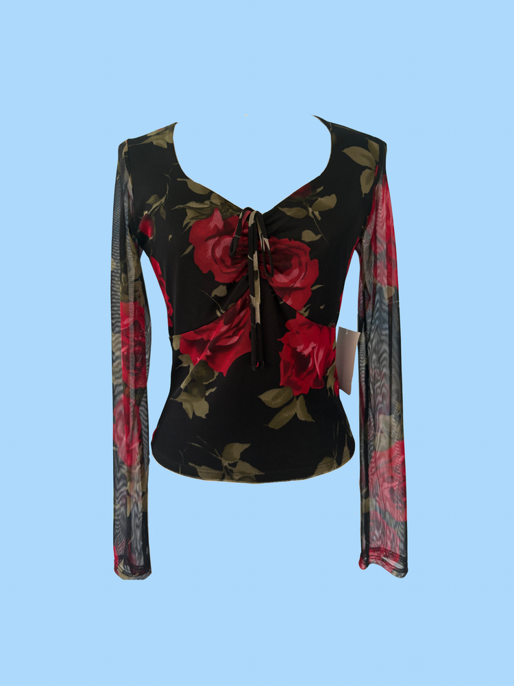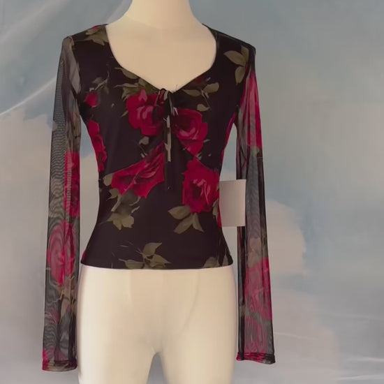 Beautiful mesh top with semi-sheer sleeves and all-over rose print with a tie-front neckline. A romantic silhouette inspired by late 90s and early 2000's style.