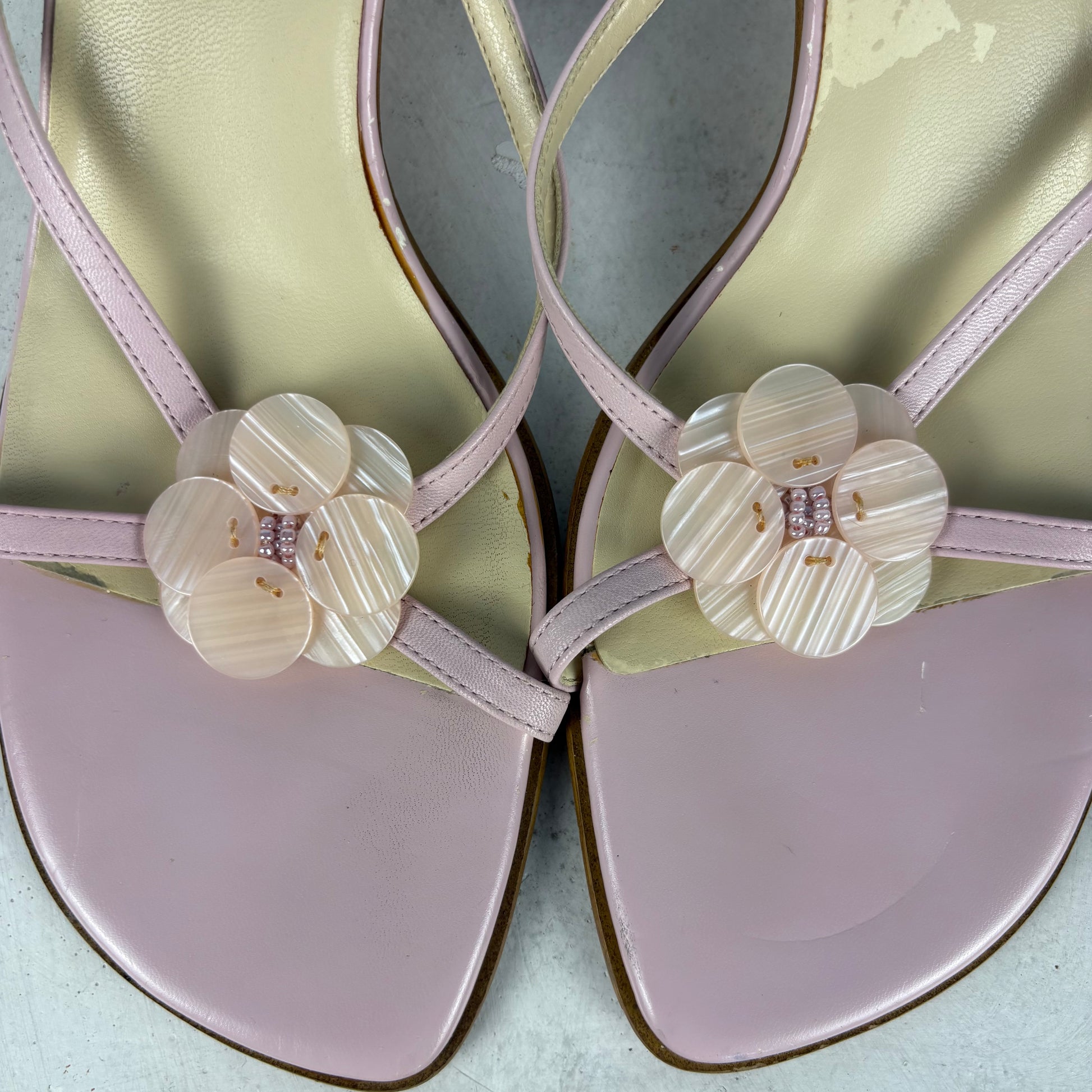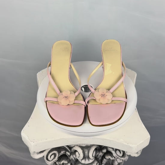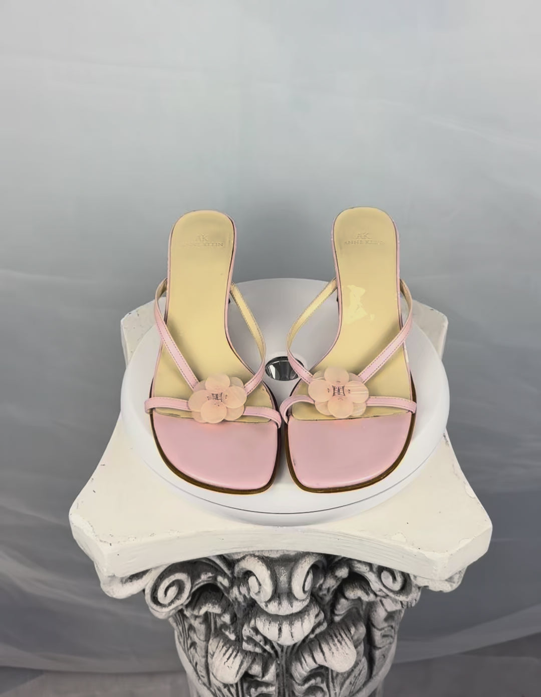 Soft blush pink kitten heel with floral detailing and a slightly flared wooden heel. These heels are a timeless romantic style that work for both casual and dressier occasions.