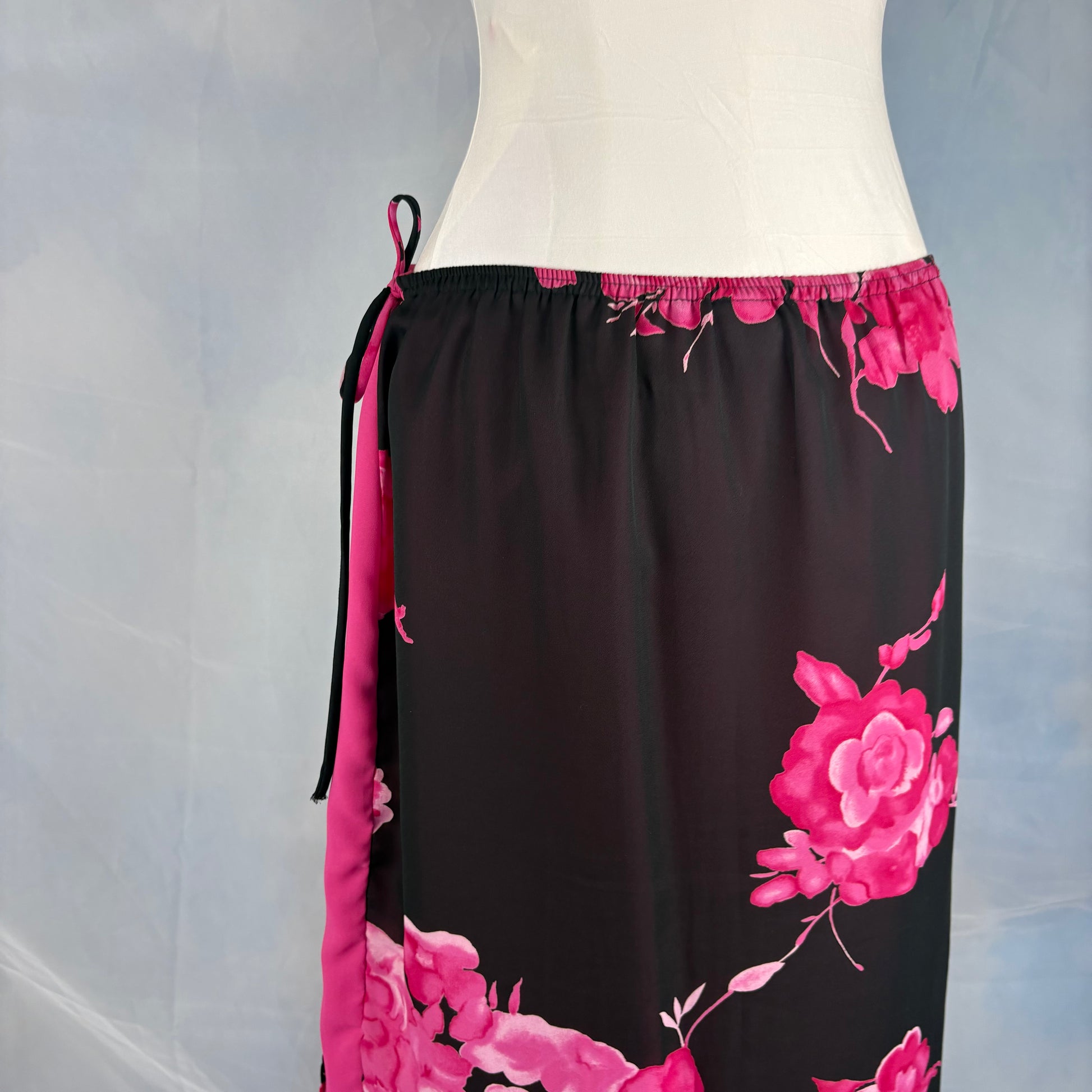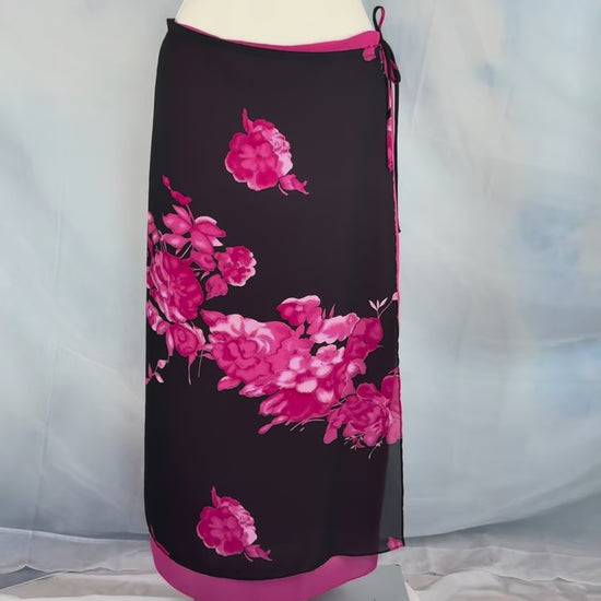 Black wrap skirt with pink floral print and contrast pink trim. Adjustable side tie closure with interior button and elastic back waistband. Lightweight fabric with full lining.