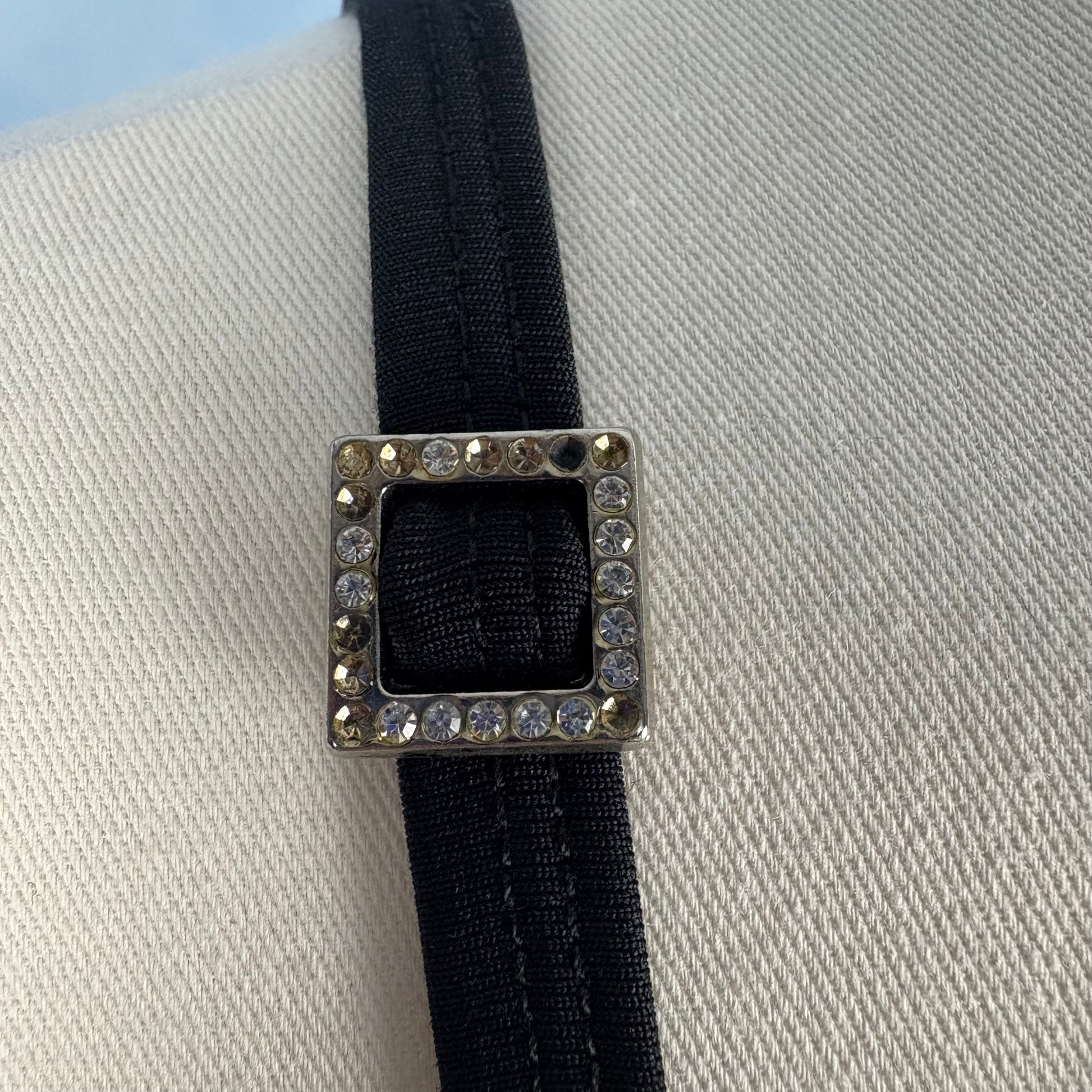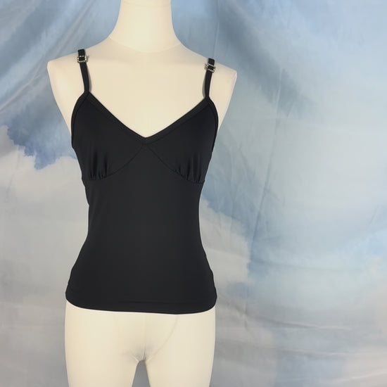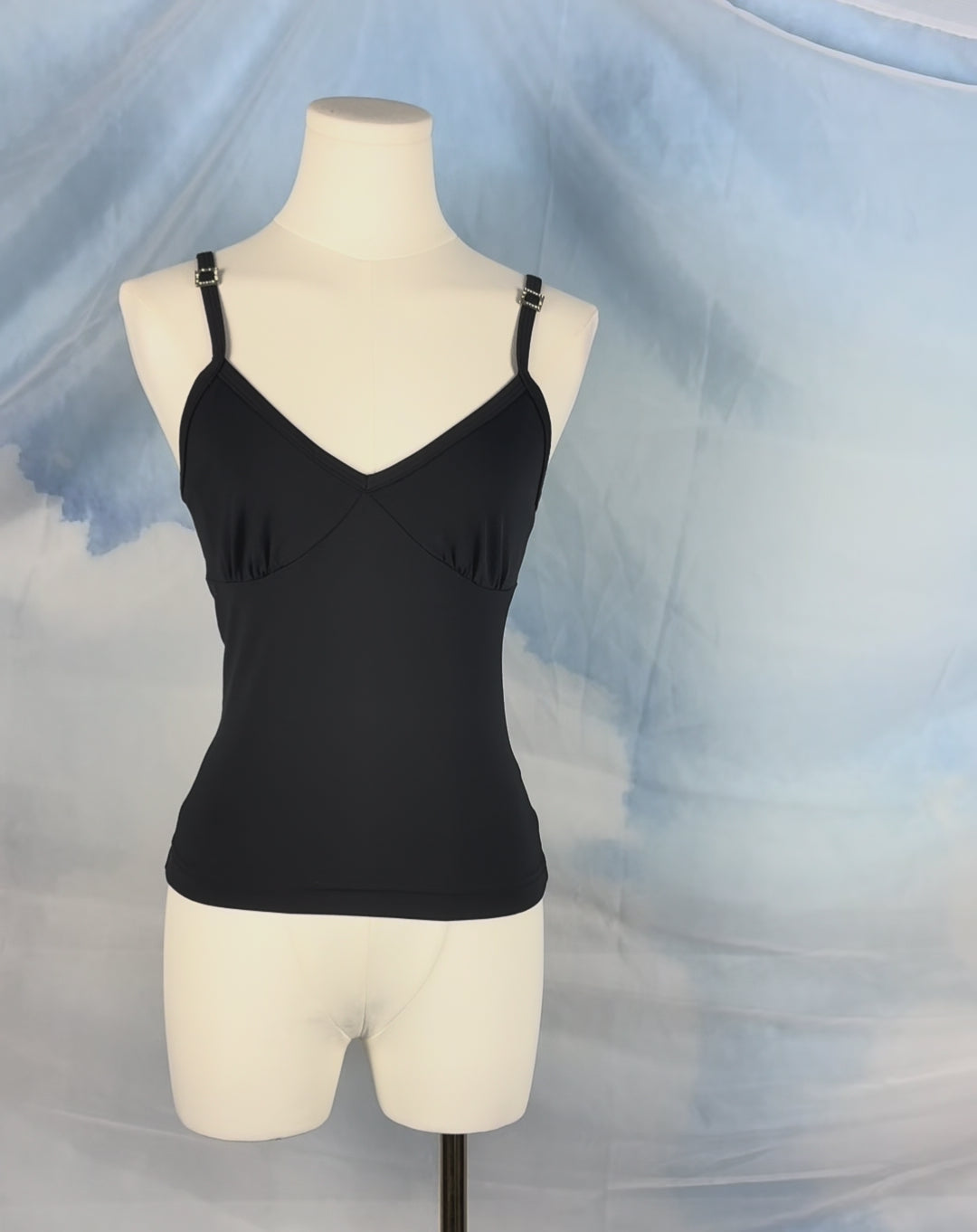 Fitted black tank with a flattering V-neckline and rhinestone-accented square strap details. A sleek staple with just the right amount of detail.
