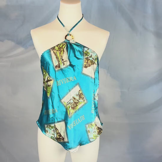 Scarf style halter top with a tie neck and circular ring detail at the front. Features an all over blue "Riviera" print with postcard style scenic graphics and an open back.