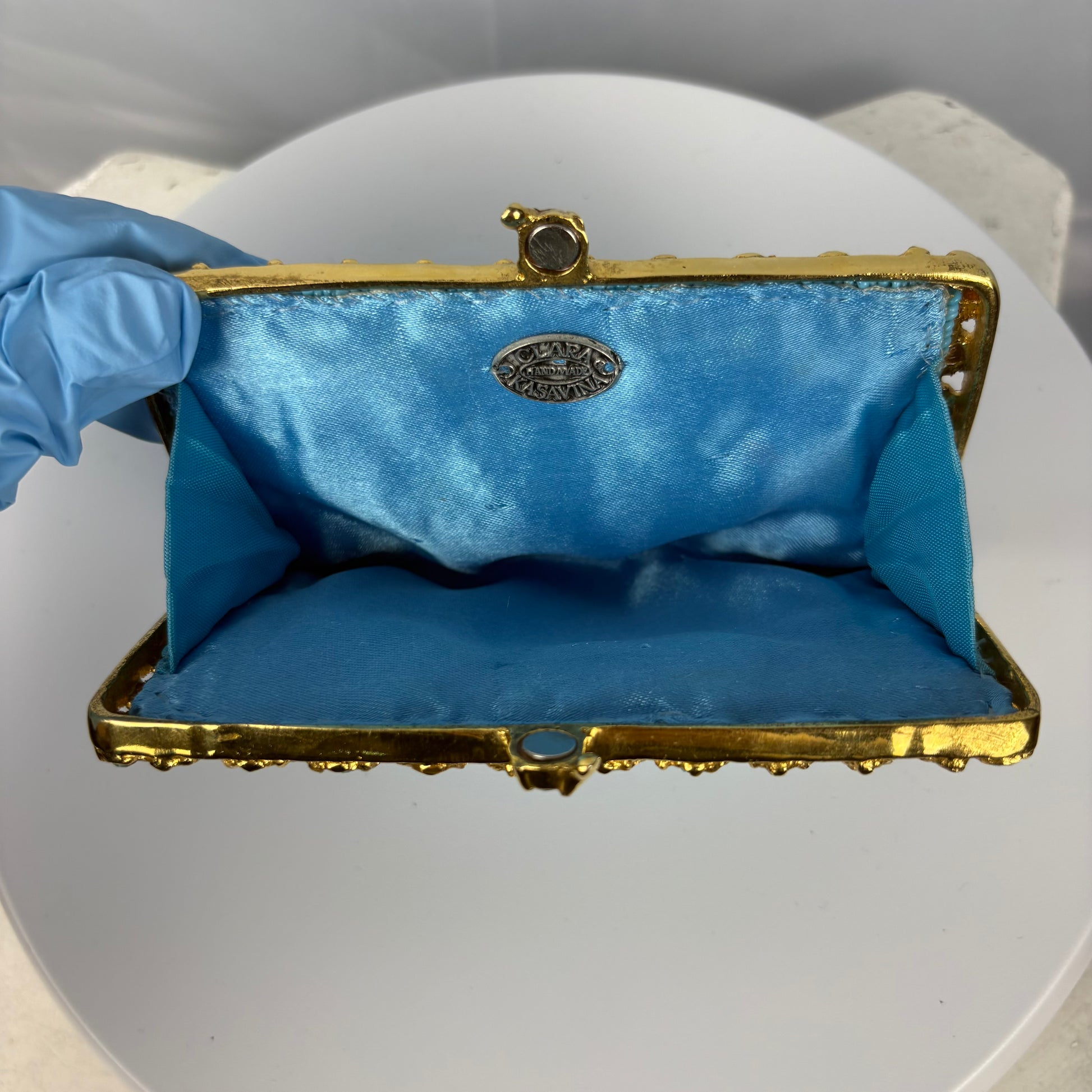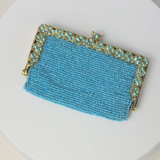 Handcrafted mini coin purse featuring a fully beaded turquoise exterior with a gold tone metal frame. The top and sides are accented with matching crystal detailing and a decorative magnetic closure. Opens to a smooth blue satin-lined interior with designer plaque. A stunning, timeless piece.