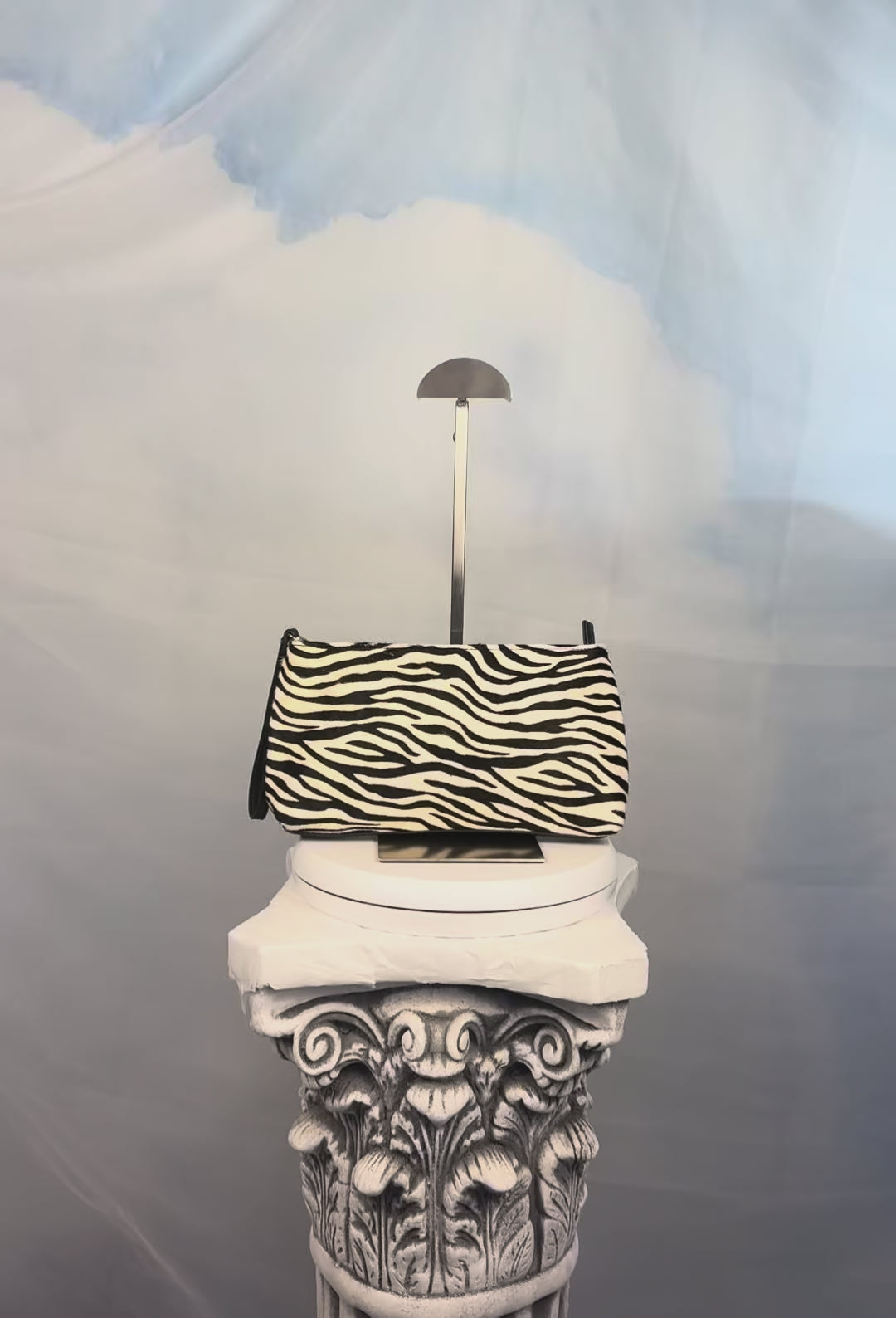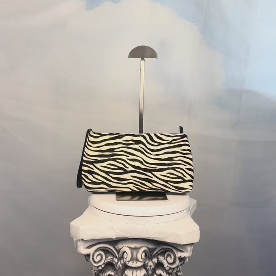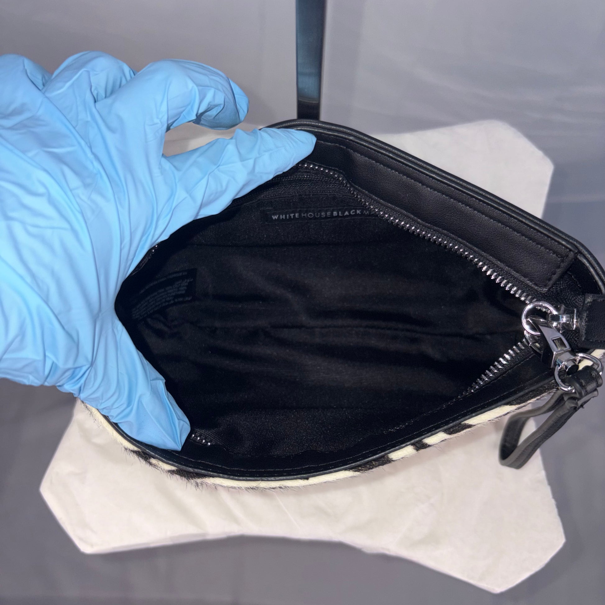 Versatile calf hair wristlet clutch featuring a bold black and ivory zebra print. Features a zipper top closure and a convenient hand strap. The interior is lined in black fabric and has a large single compartment with a small interior pocket.